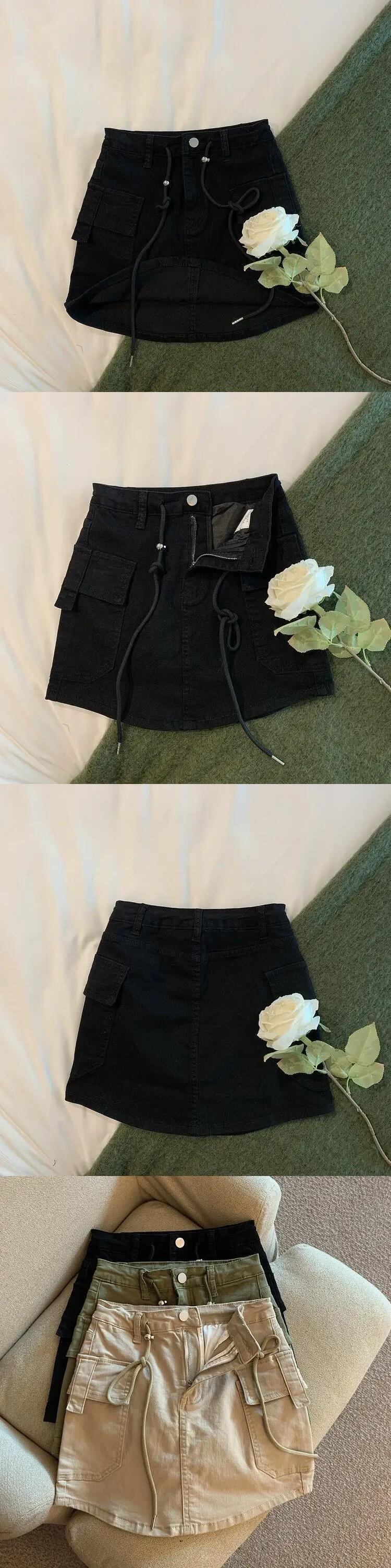デニムミニカーゴスカート夏ウエスト巾着大きポケットジーンズプレッピースタイル s サマー 夏物