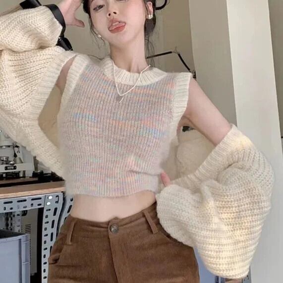 オールマッチ ニット 2 点セット クロップド カーディガン + ノースリーブ タンク ベスト Y2k 美的プレッピー スタイル トップス