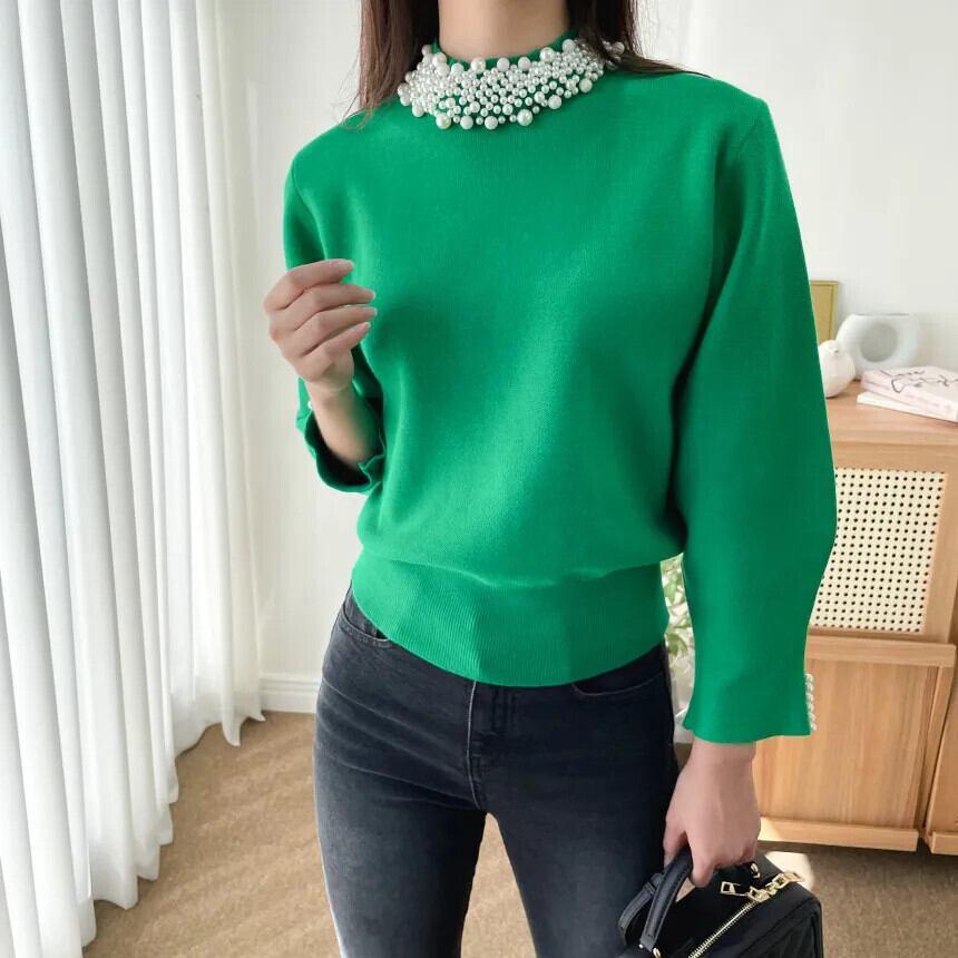 ニットスタイルルース秋冬プルオーバーセーターパールクロップド黒人トップ ブラック オータム 秋物 ウィンター 冬物 真珠