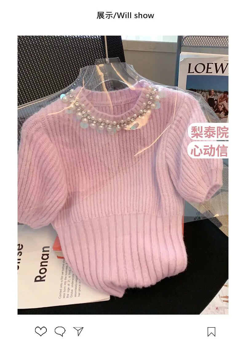 ジャンパー ピンク パープル パール半袖セーター夏ランタン ラインストーン ニット トップ プル ビーズ ショート ハーフスリーブ サマー 夏物 真珠