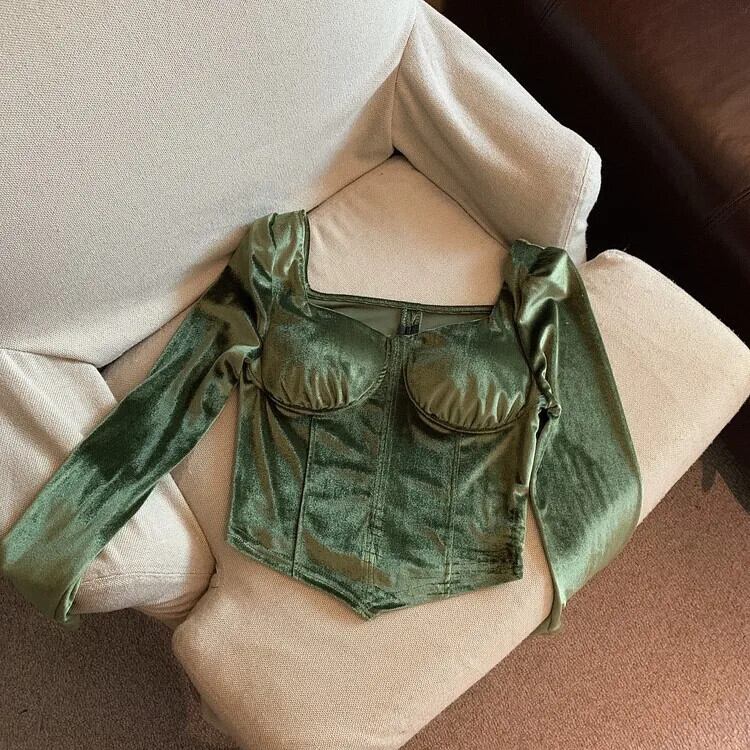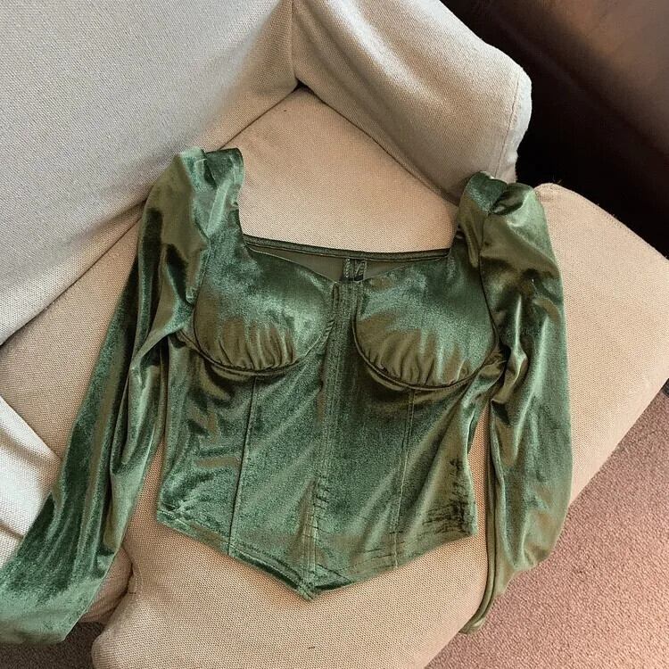 V ネックベルベット長袖 Tシャツセクシースクエアクロップトップスグランジスパイシーガールショートフィッシュボーントップボトムロパシャツ ロング Vネック スクウェア