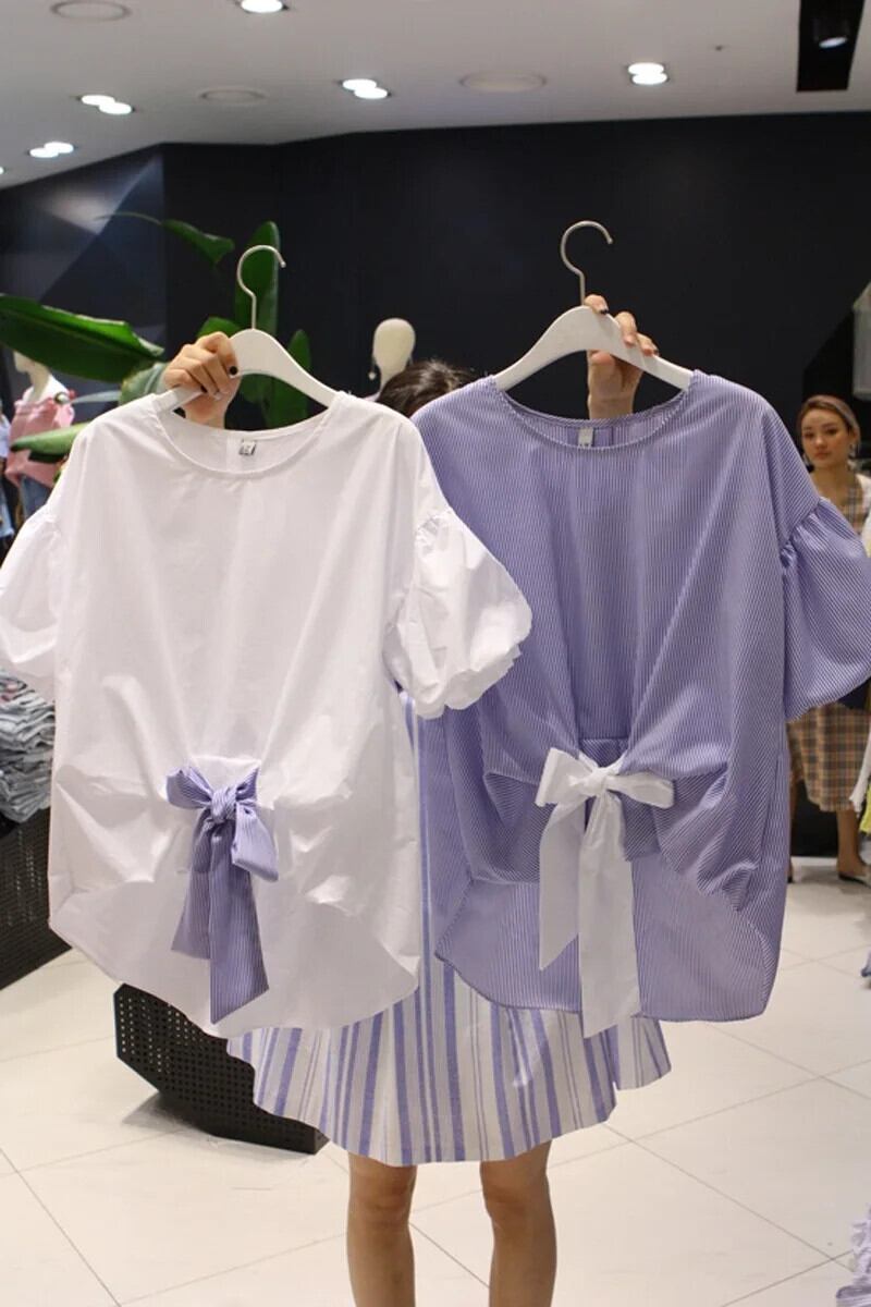夏ストライププルオーバー半袖 Tシャツ学生ボウトップ白青原宿 Y2k グラフィック Tシャツクロップ Tシャツ ショート ホワイト ブルー リボン ハーフスリーブ かわいい サマー 夏物