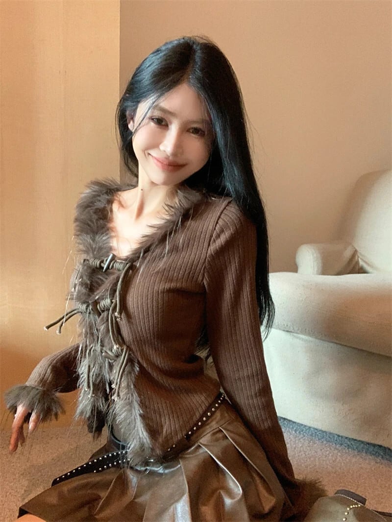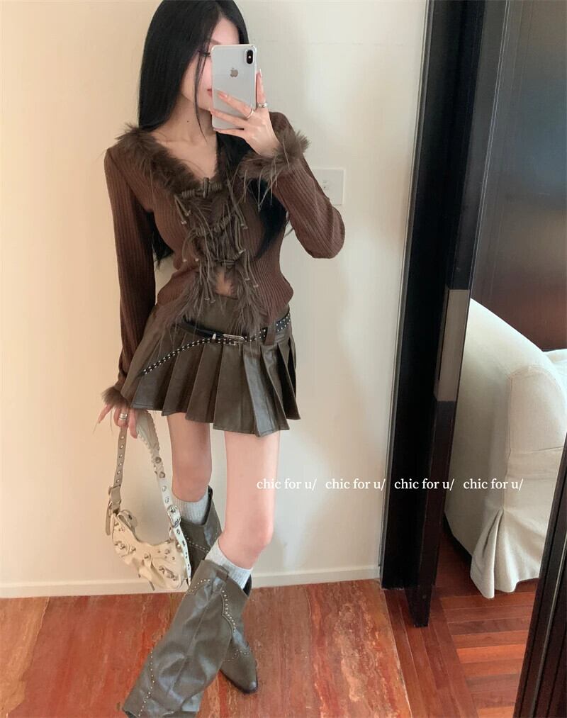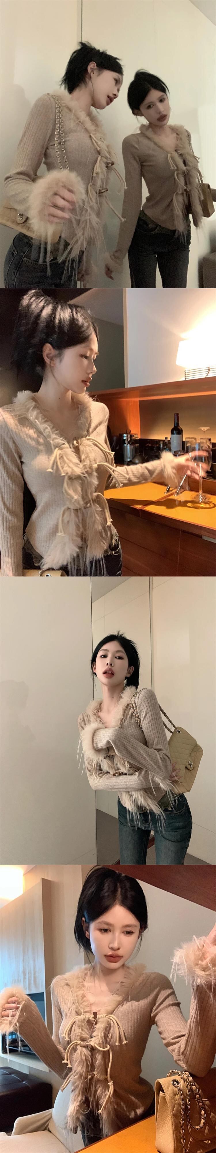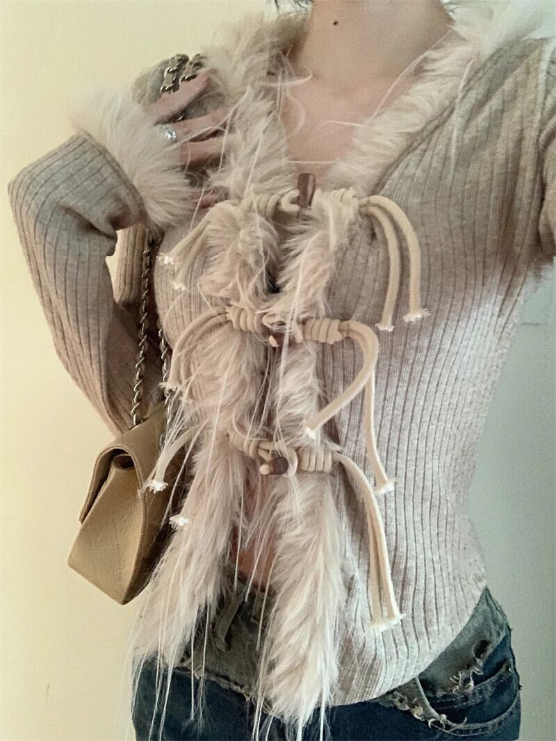 クロップドカーディガンセータースリム Y2k V ネックレースアップニットトップスシンプルコートプル Vネック