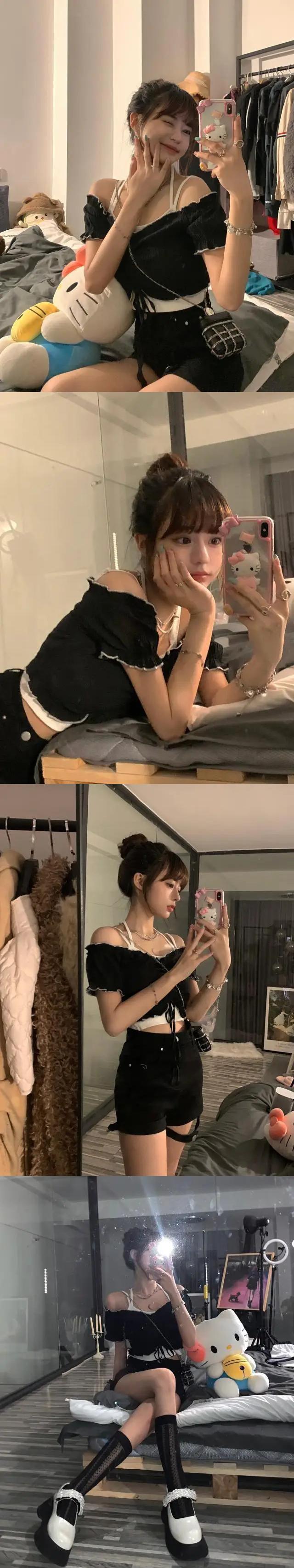 ブラウスセクシーオフショルダークロップトップフリルシャツパフスリーブ原宿 Tシャツシフォン巾着 T ラッフル かわいい