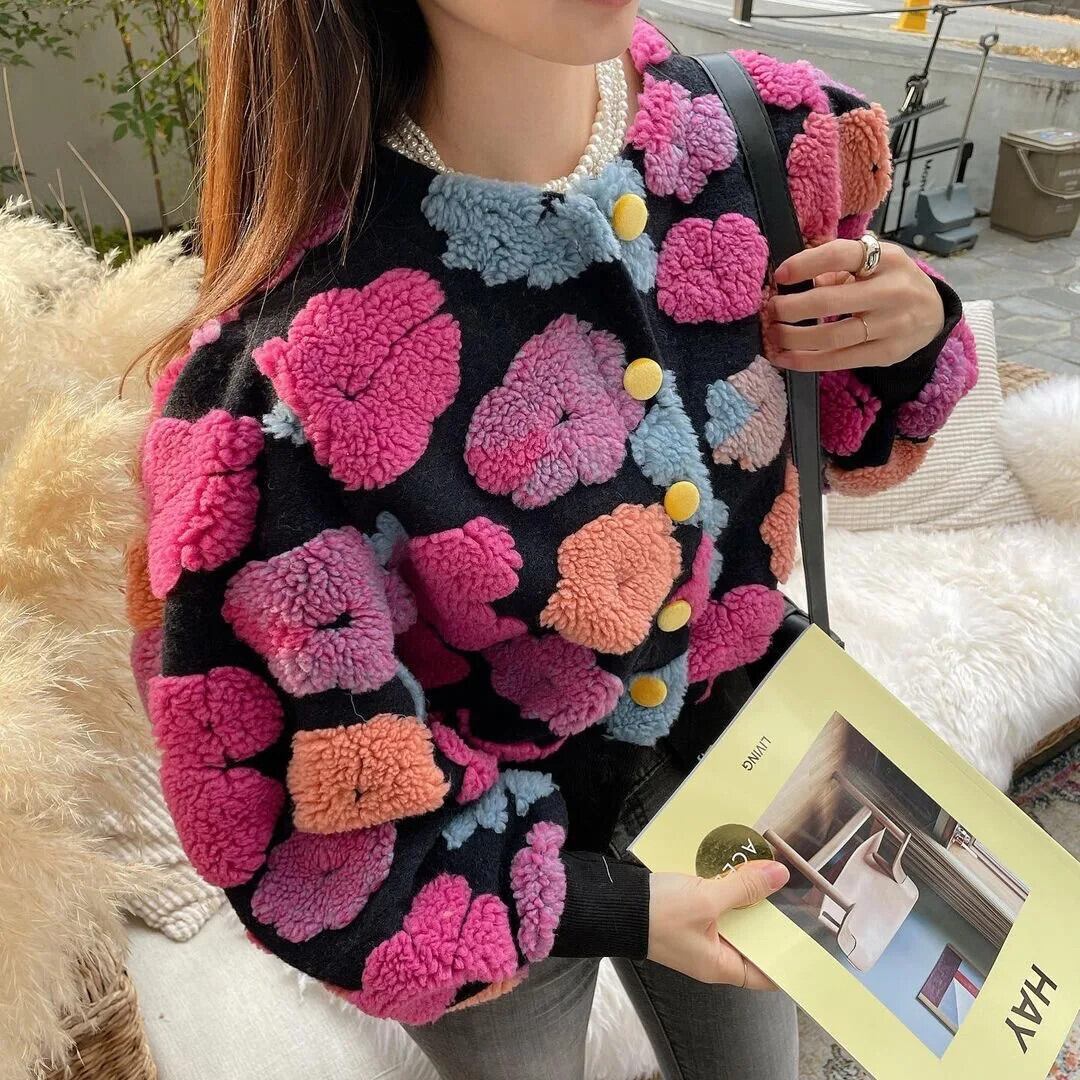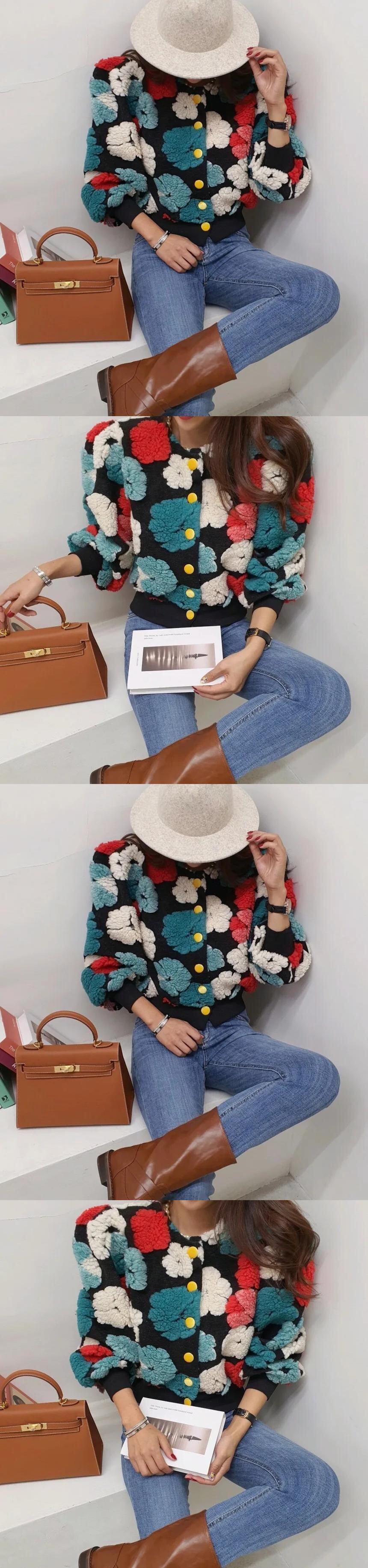 ボタン花アップリケ長袖ジャケット厚く暖かい冬ストリート生き抜くラムウール ロング ウィンター 冬物 花柄