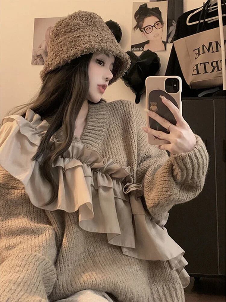 プルルーズ長袖ニットトップパッチワークプルオーバーセーター生き抜く Y2k セーターフリル ロング
