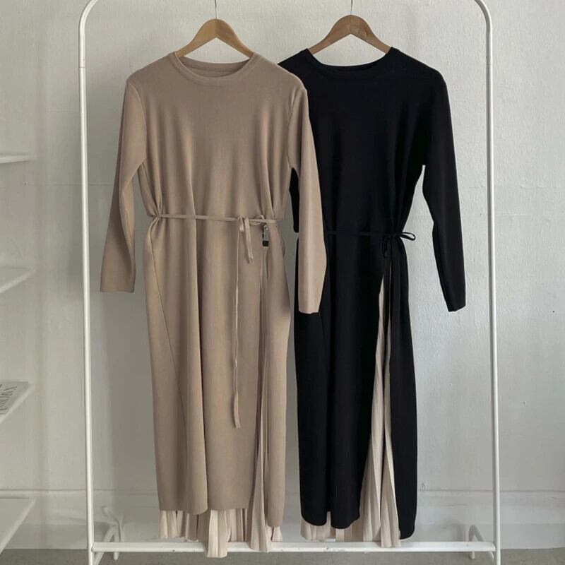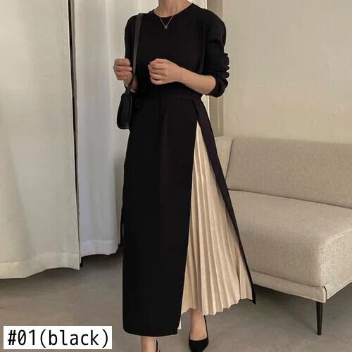 ラウンドネックパッチワークブラックプリーツドレスニットフェイクツーピースレースアップウエストマキシ Vestidos デ Y2k パーティー Oネック