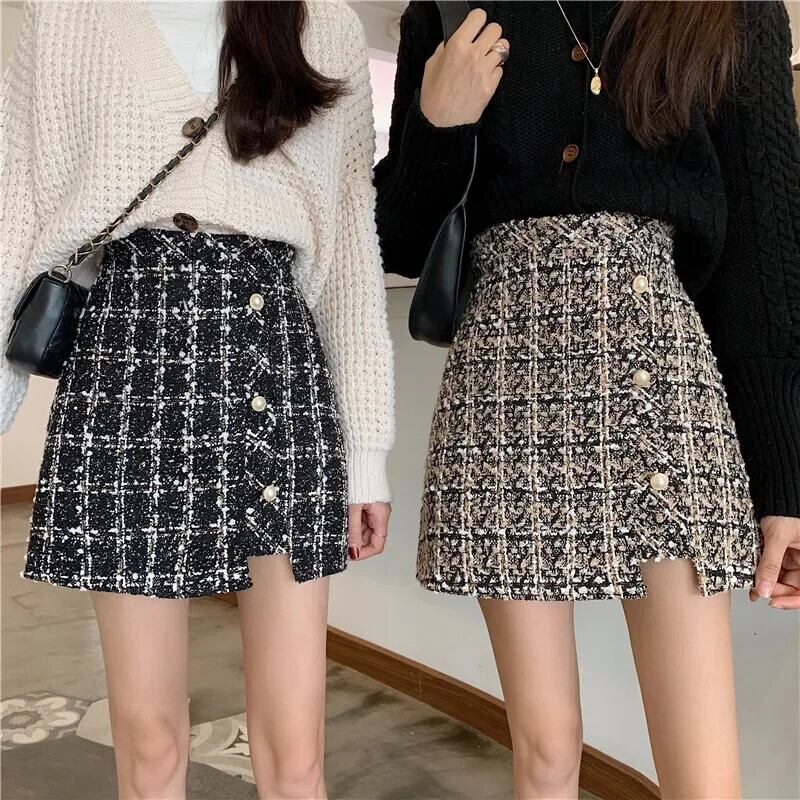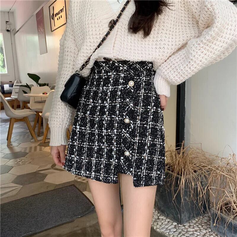 スタイル厚い黒ツイードスカートウエスト A ラインラップ臀部香りチェック柄スカートミニペチコート Faldas Y2k ブラック Aライン