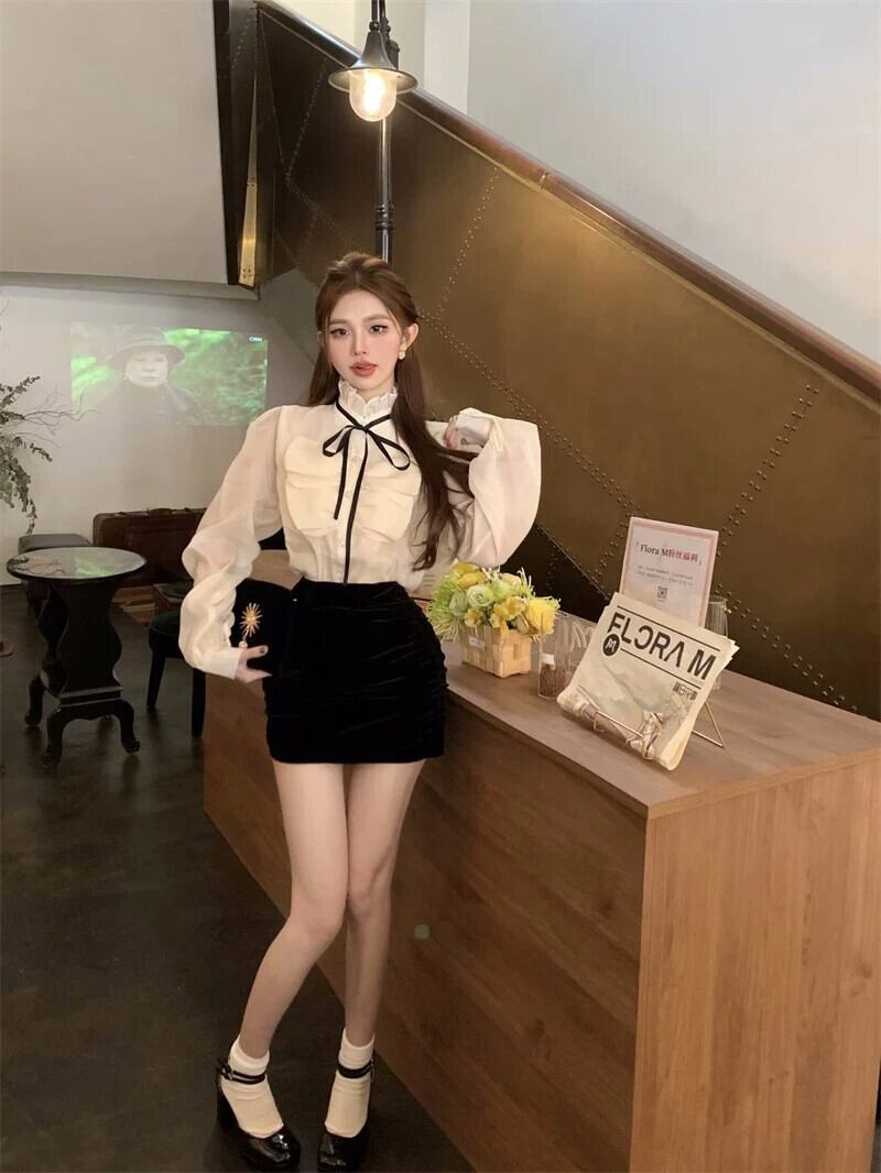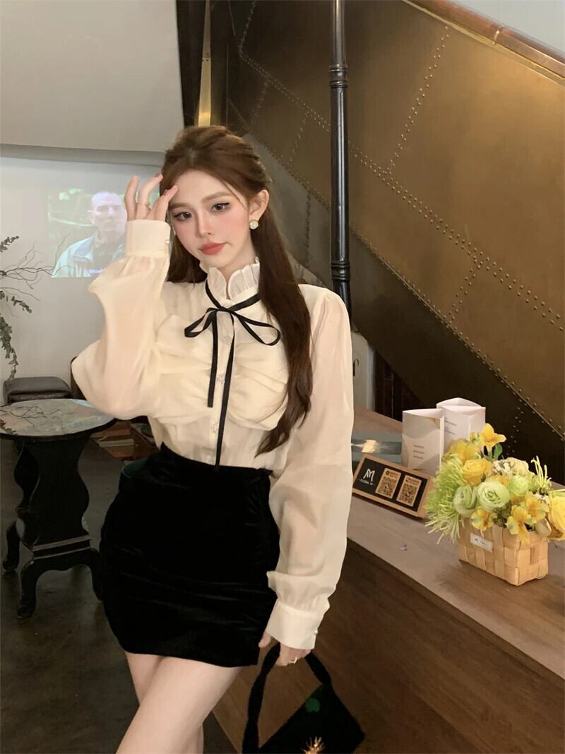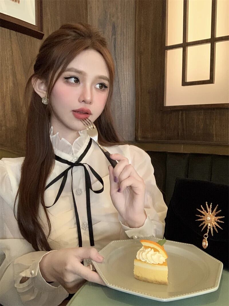 フレンチネック長袖シフォンシャツ秋レースアップ弓スタイルスモールトップブラウスシャツ ロング リボン オータム 秋物