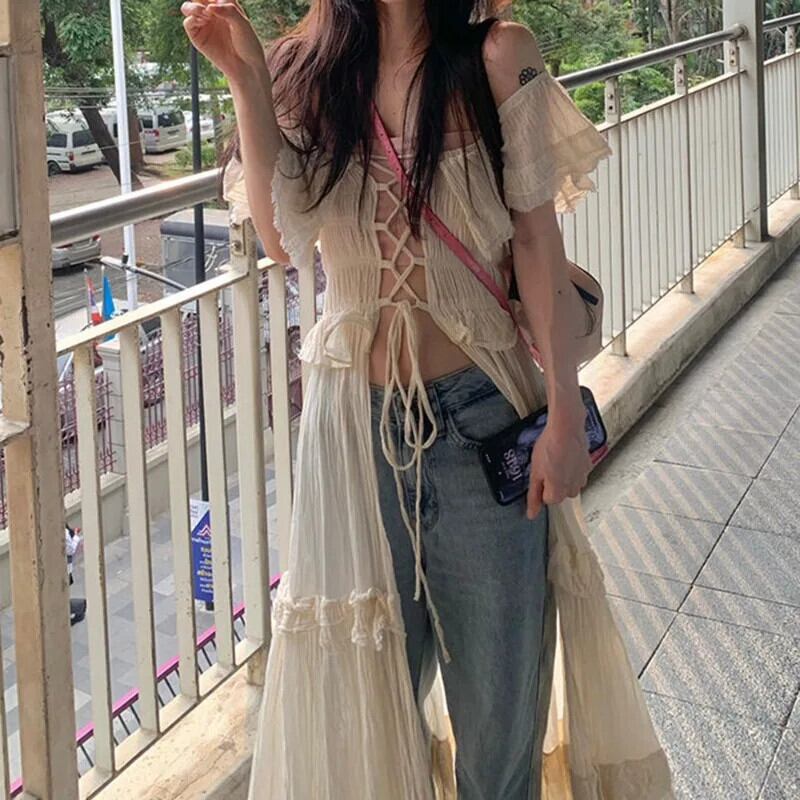 サマードレス包帯甘いフリルローブ Vestidos デ チュニック マキシドレス ラッフル 大人ガーリー スウィート キュート カジュアル 夏物