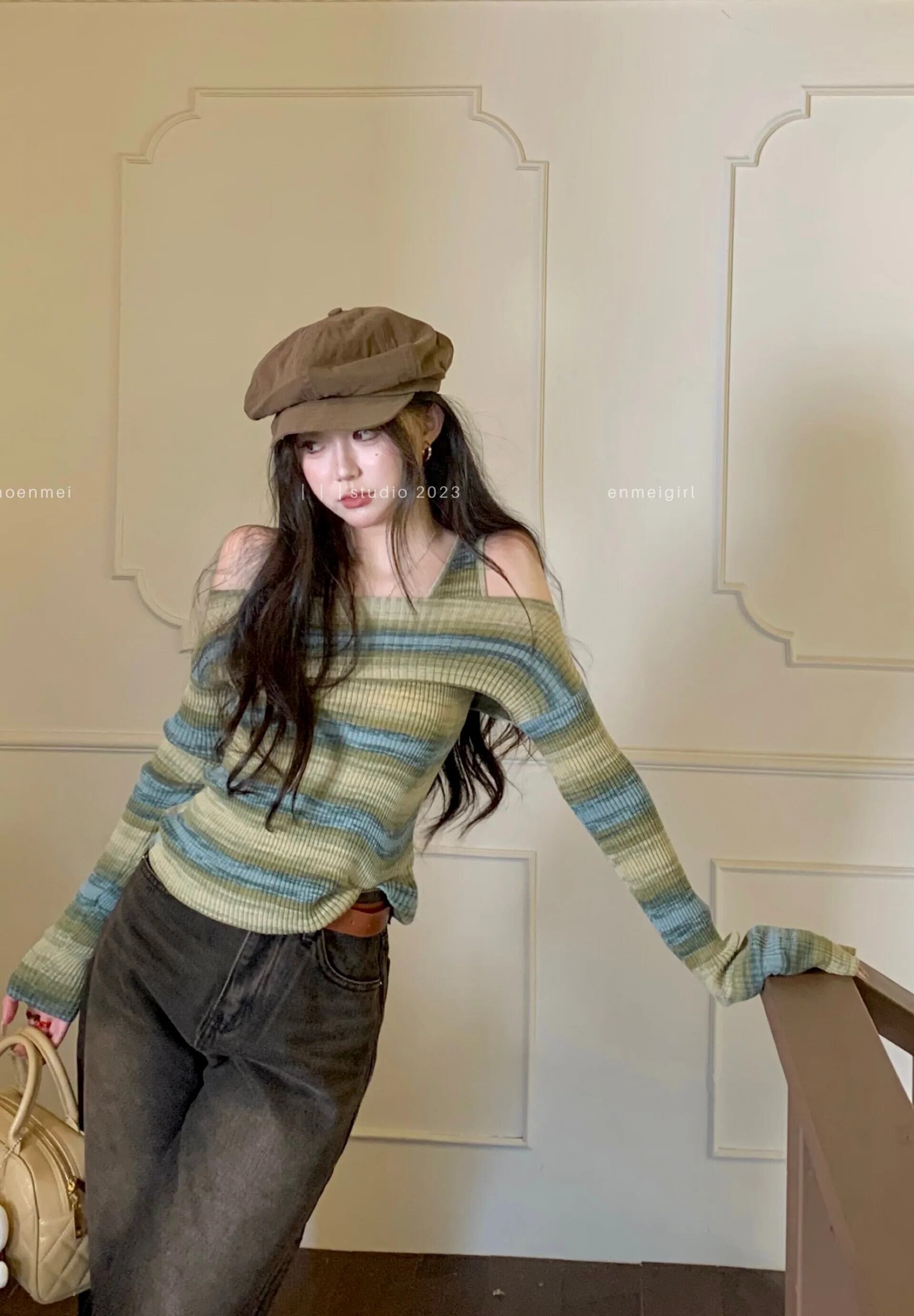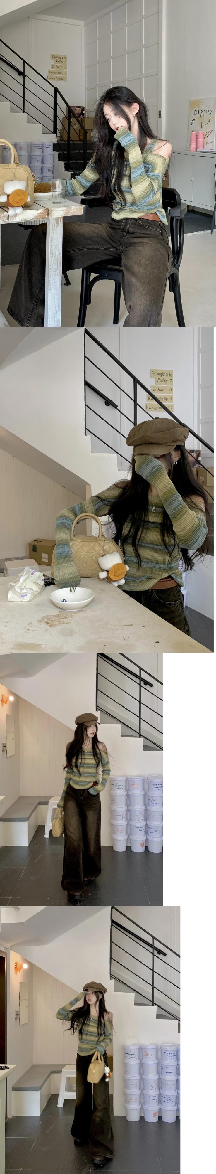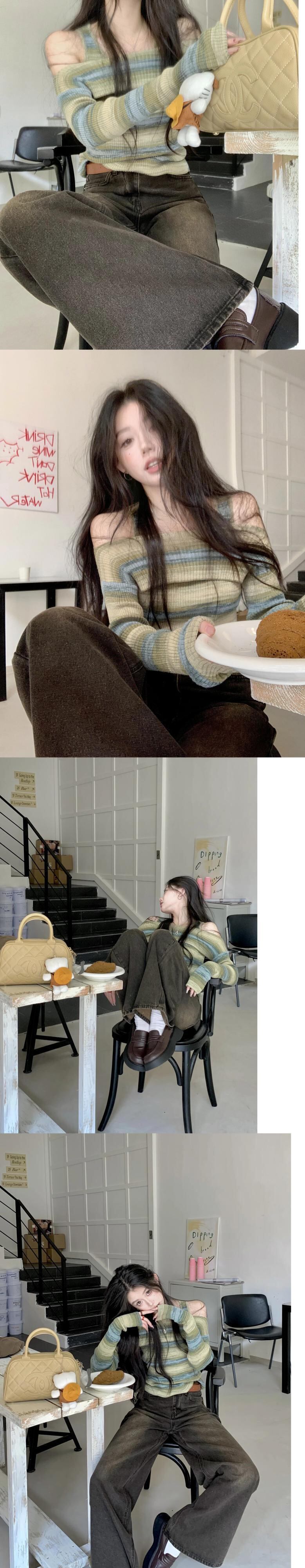 原宿ニットジャンパーストライプ長袖秋スラッシュネックセータースリムプルオーバートップグランジクラブ Y2k ロング かわいい オータム 秋物