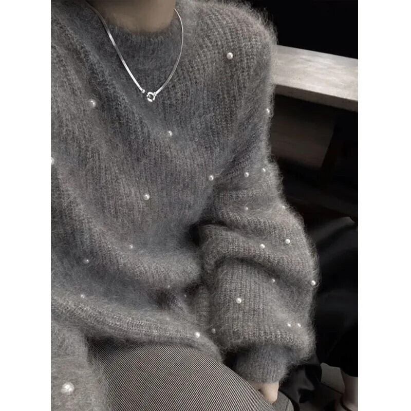 ese 怠惰スタイルレトロルーズラウンドネックニットセーター Hotsweet Y2k プルオーバーグレーセーター 2024 特大トップ 大人ガーリー スウィート キュート カジュアル Oネック