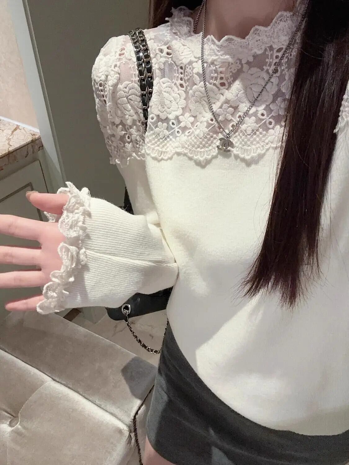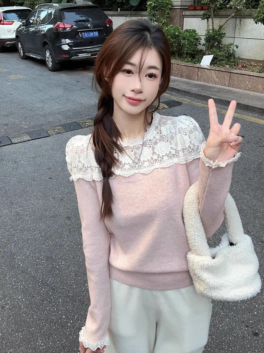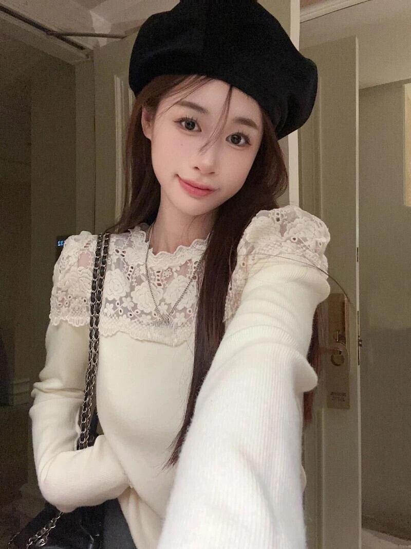 甘いレースシャツパッチワーク偽 2 セーターシックセータースリム長袖トップピンクニットジャンパー ロング 大人ガーリー スウィート キュート カジュアル