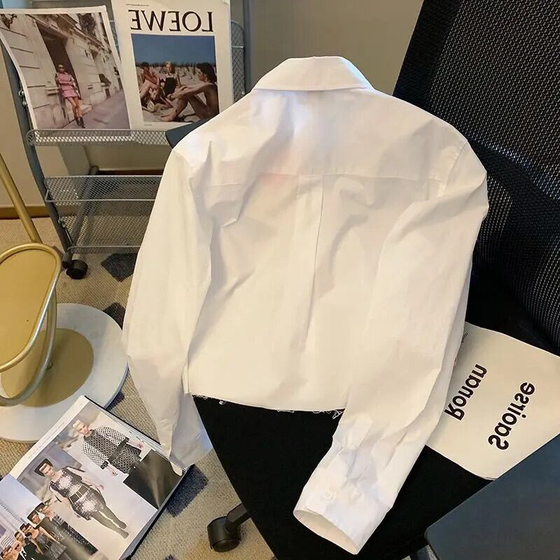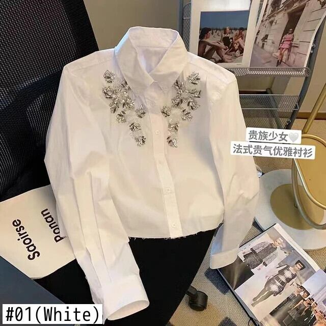 De Moda 2024 オフィスレディブラウスワークスタイル Hotsweet Y2k 袖白シャツラインストーントップス ホワイト 大人ガーリー スウィート キュート カジュアル 会社 学校 通勤や通学にも