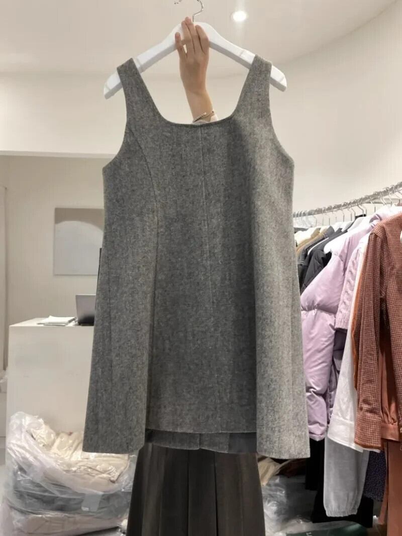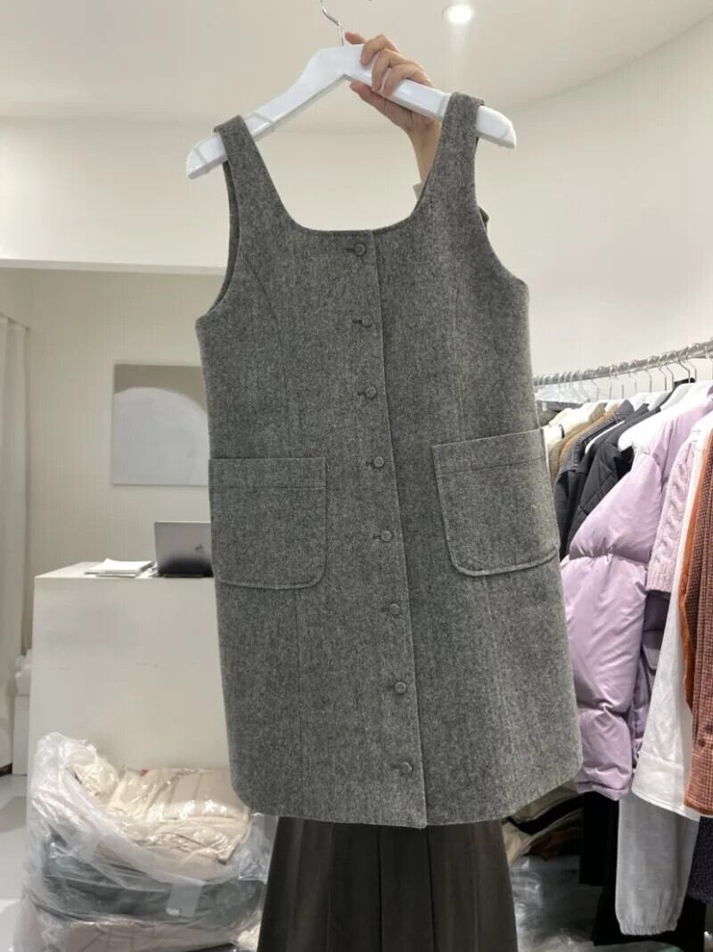 秋スクエアネックシングルブレストソリッドカラー気質ミニマリストポケットノースリーブドレスグレー Vestidos ローブ黒ベスト ブラック オータム 秋物 スクウェア