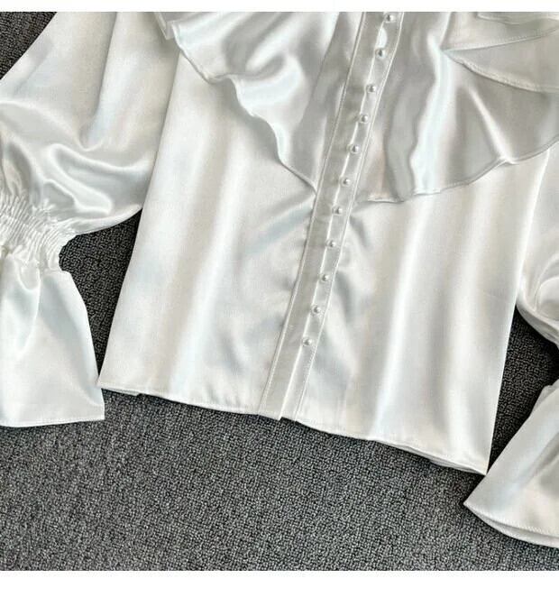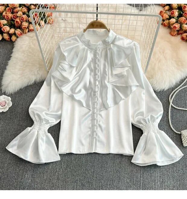 サテンルーズシャツロングフレアスリーブフリルOネックビーズ優しいオフィスレディブラウススタンド レッド ラッフル 会社 学校 通勤や通学にも