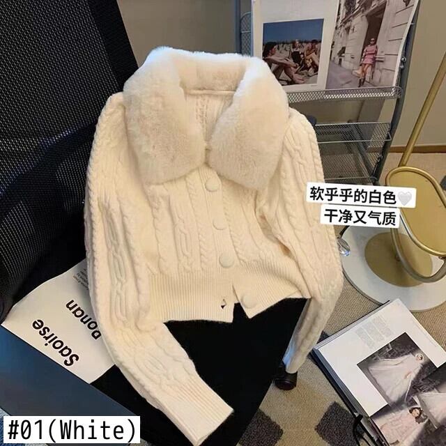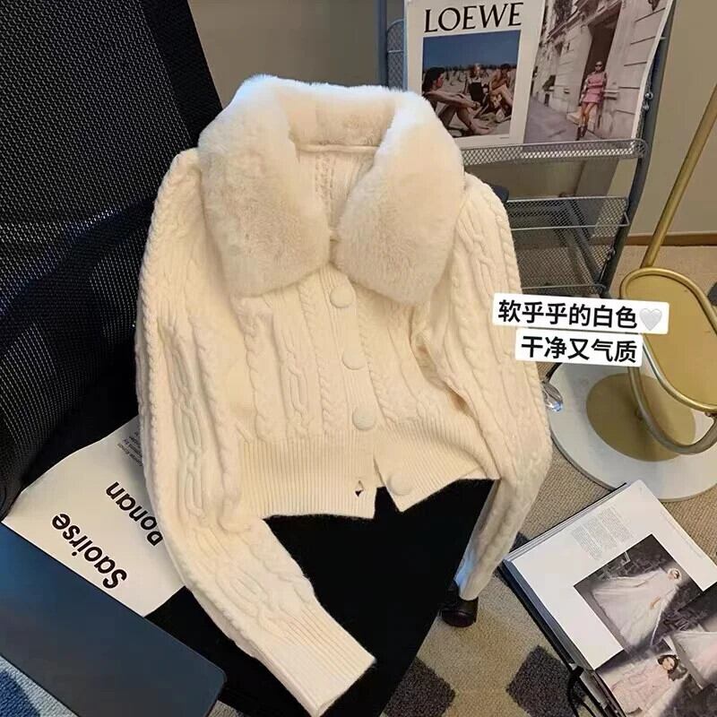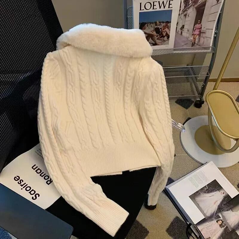 秋冬リブニットカーディガンセーター毛皮トリム襟長袖スリムジャンパーニットレディシックセータートップ ロング オータム 秋物 ウィンター 冬物