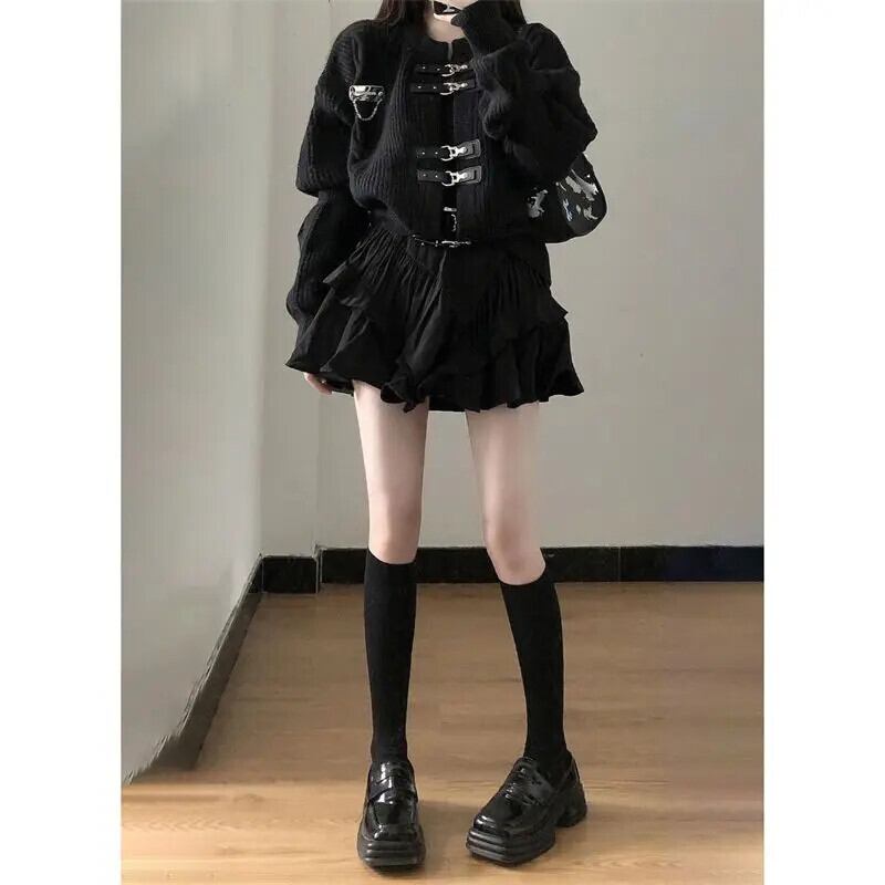 秋カーディガンジャケット黒セーターニットスカートセットセーターコート Y2k プル ブラック オータム 秋物