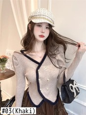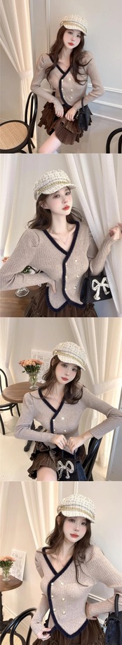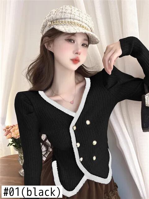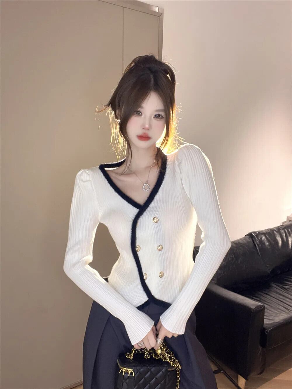 ダブルブレスト長袖ニット不規則クロップトップジャンパーボトムスリム V ネックセーター黒コート ロング ブラック Vネック