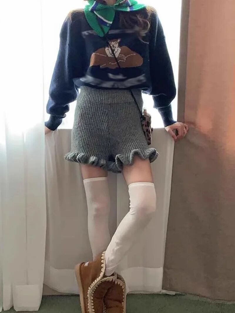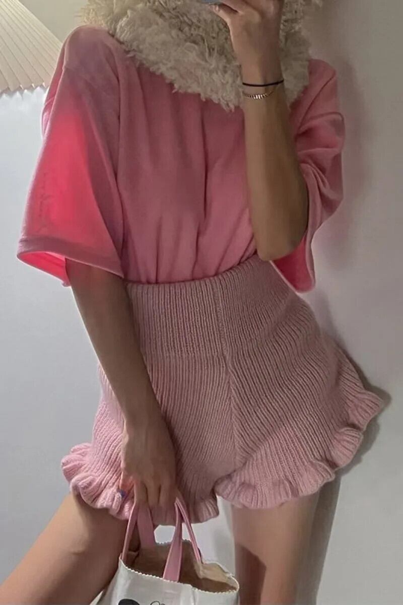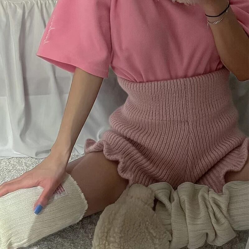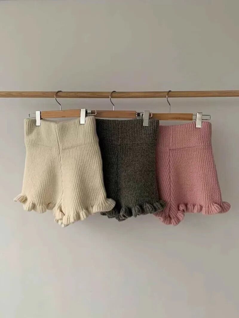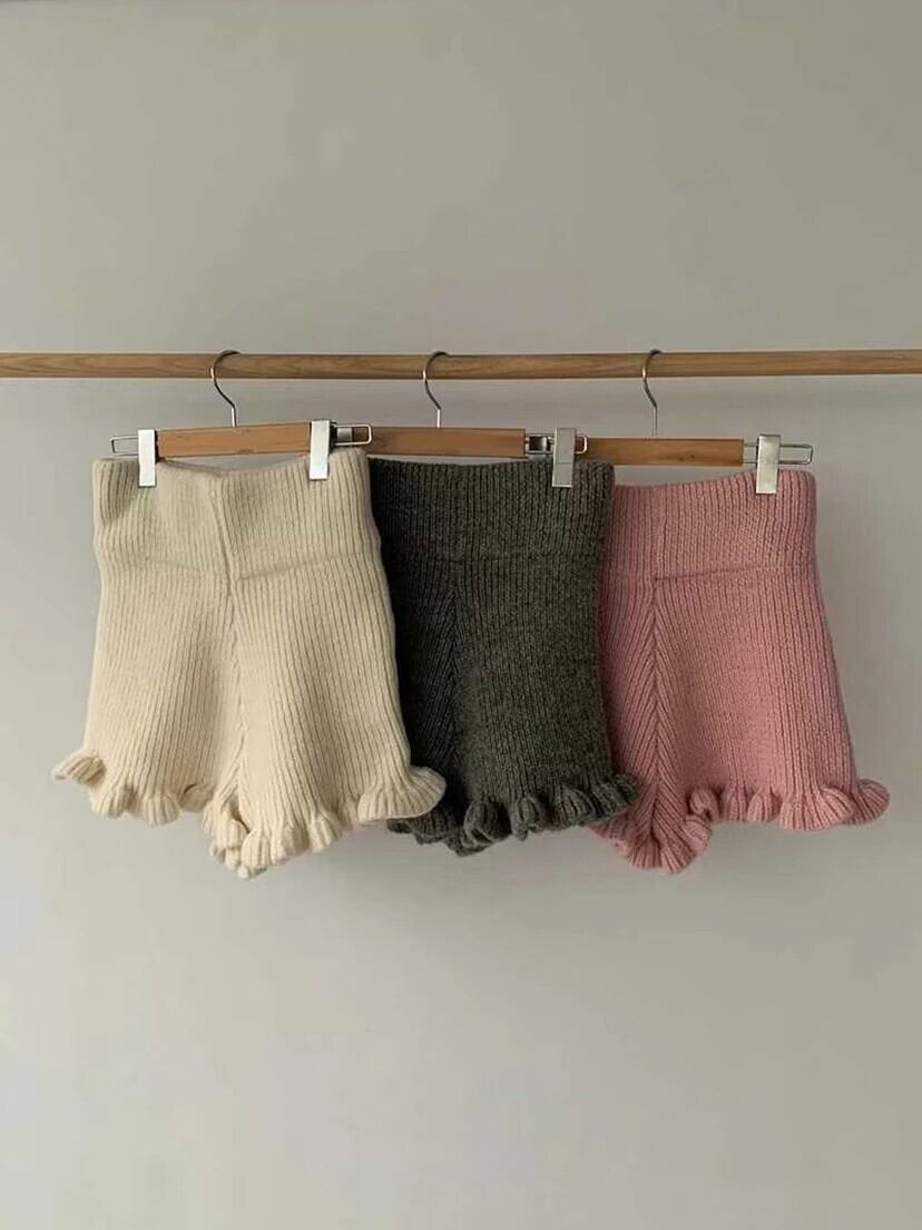 ウエストワイド脚ルーズショート厚い 2024 秋ソリッドフリルグレーニットピンクショーツ Pantalones Cortos デ オータム 秋物 ブルマー ワイドレッグ ワイドパンツ ソリッドカラー