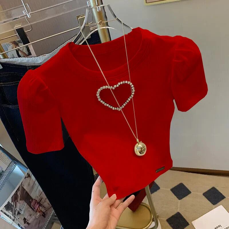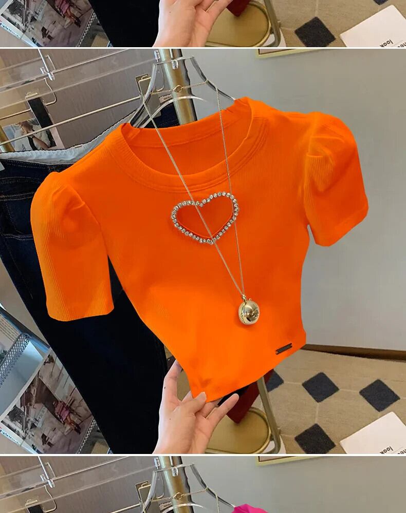 スリム愛白半袖 Tシャツパフクロップトップスグランジ Hotsweet Y2k トップ 2024 シャツニットソリッド Tシャツセーター ショート ホワイト ハーフスリーブ 大人ガーリー スウィート キュート カジュアル ソリッドカラー