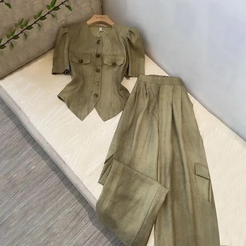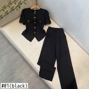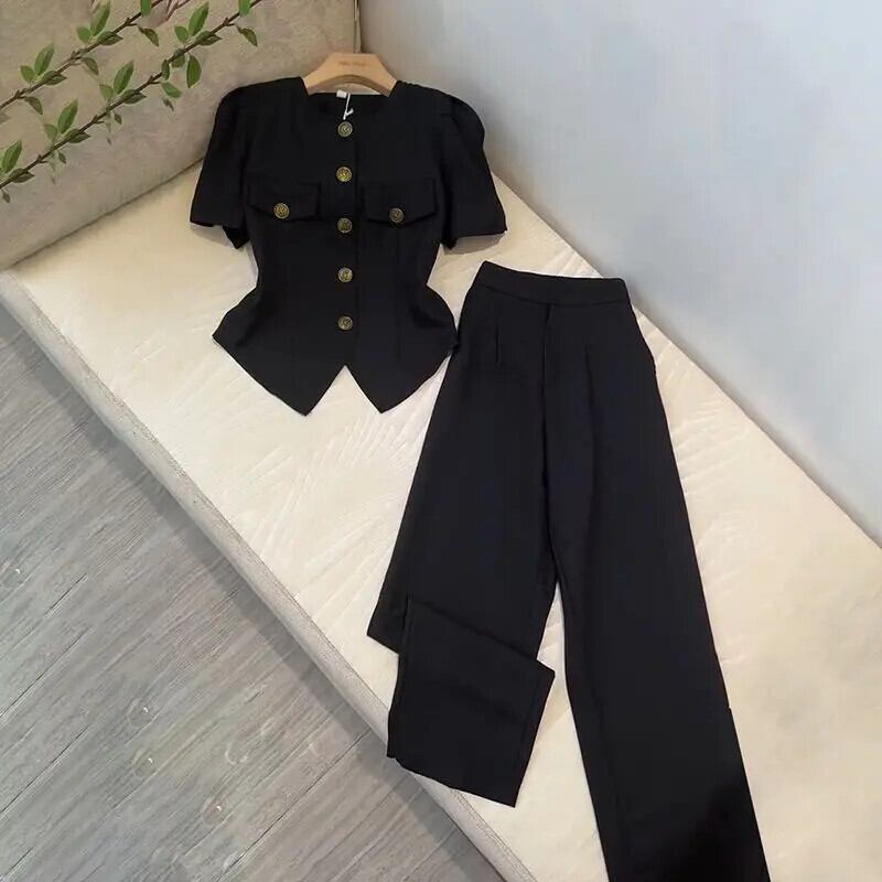 黒 V ネック半袖ブレザー 2024 パンツスーツ作物夏不規則バブルスリーブトップ 2 点セットレディース衣装ジャケット ショート ブラック ハーフスリーブ サマー 夏物 Vネック