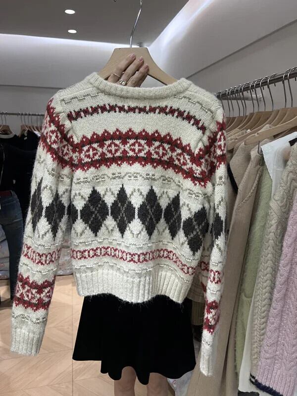 クリスマスセーターラウンドネックカーディガンボタンアップダイヤモンドカラーマッチングジャカードルーズスリーブ特大ジャケットニットY2k Oネック