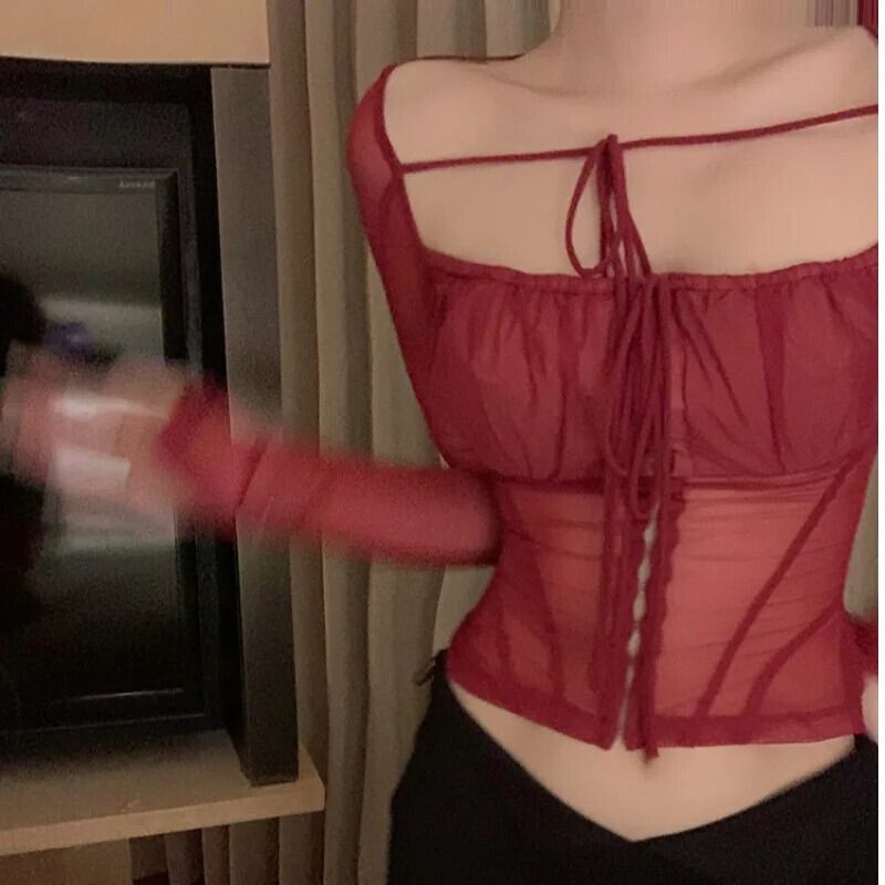 Y2k Tシャツ ese シースルーメッシュトップスレースアップアウト Tシャツ E ガールセクシー 2000 年代シフォン