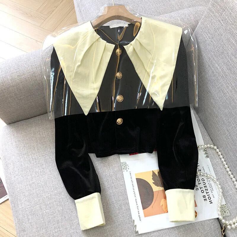 長袖ネイビーカラーシャツブラックベルベットシャツスリムメタルボタンクロップトップスカミーサ ロング