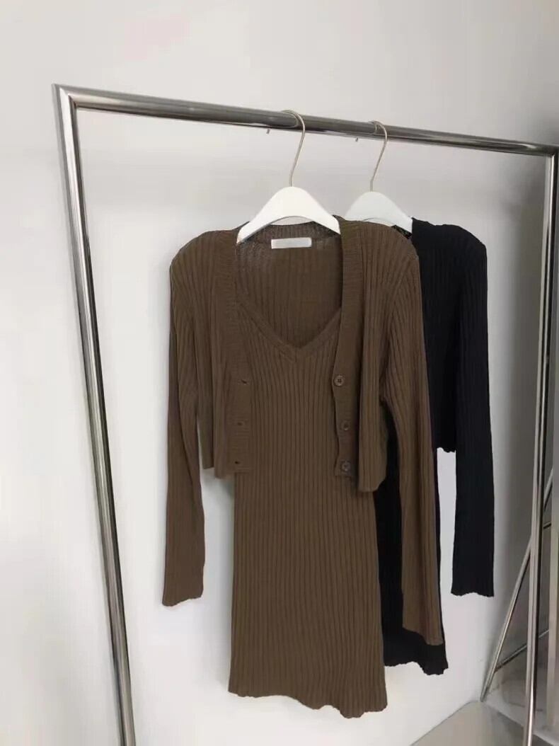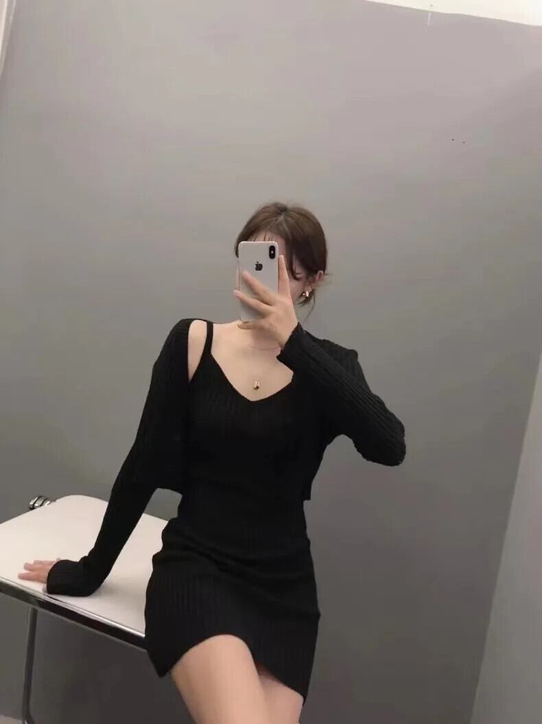 気質スリム V ネックラップヒップキャミソールドレス黒ニットカーディガン 2 点セットレディース衣装クロップドトップス ブラック Vネック
