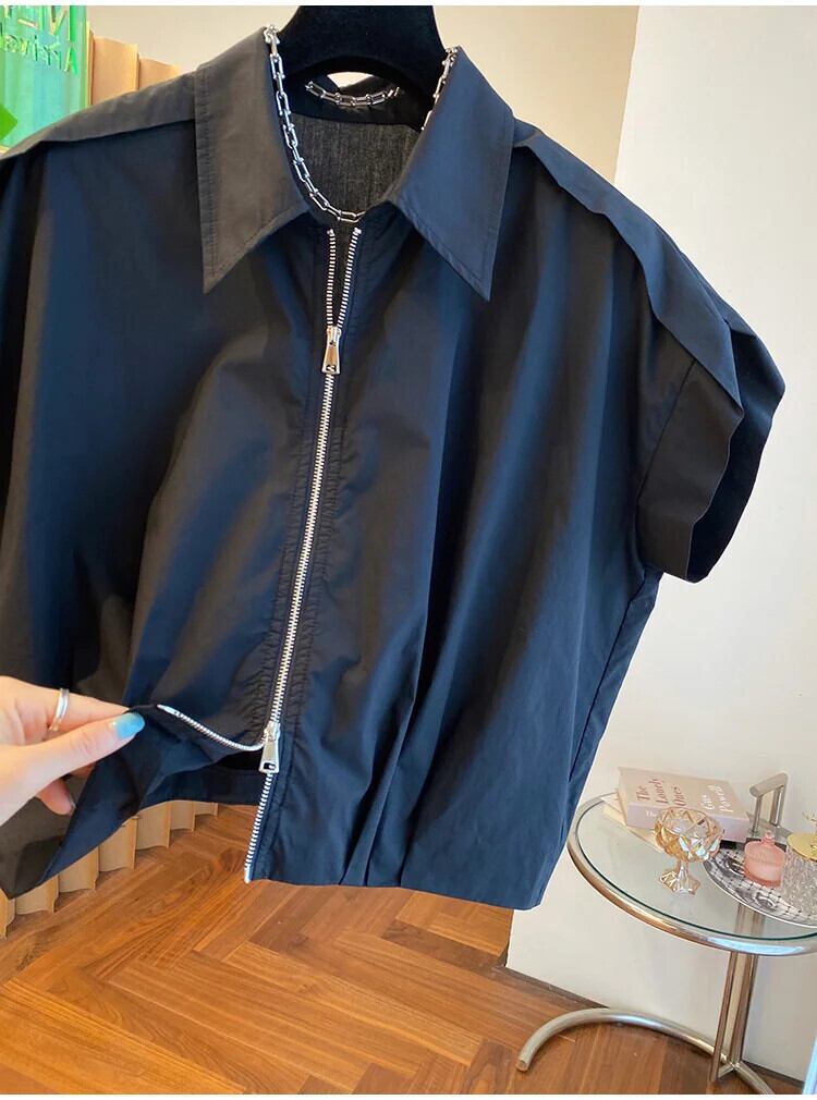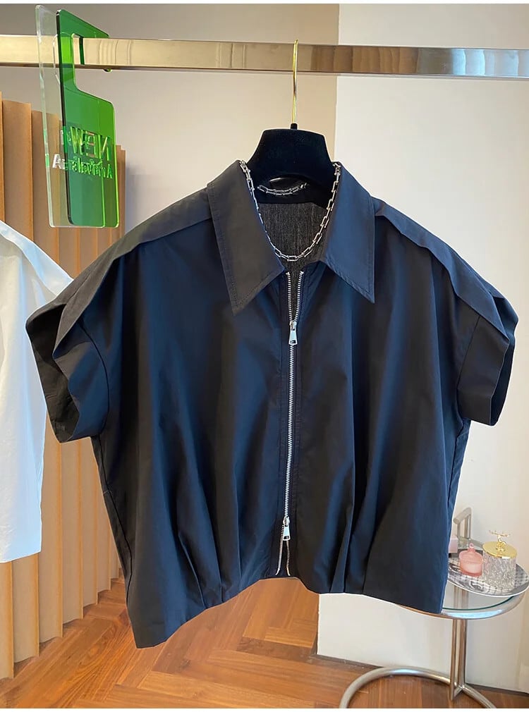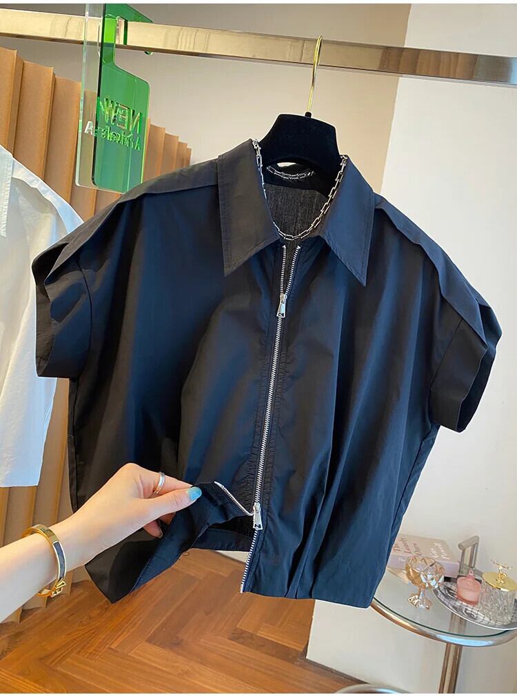 ルーズブラウスターンダウン襟半袖ジッパークロップトップスシックサマーシャツホワイトデモーダ ショート ハーフスリーブ 夏物