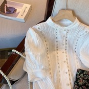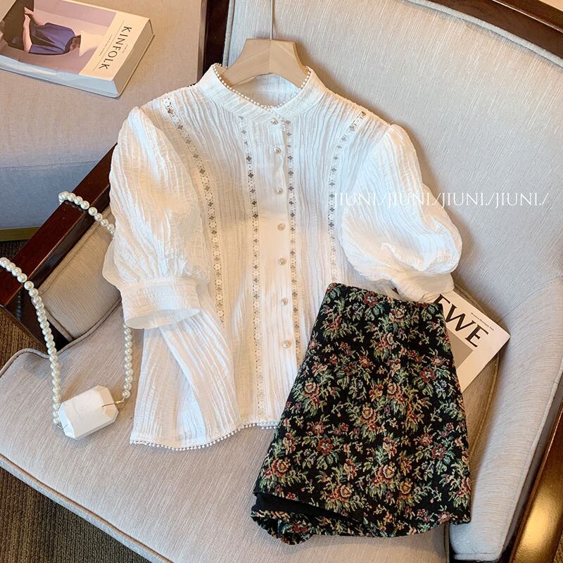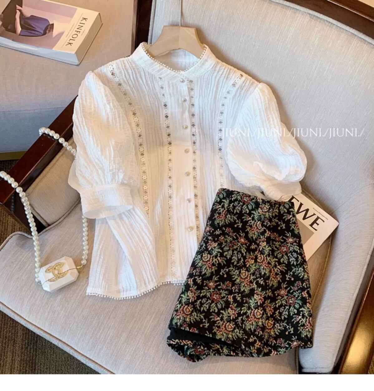レースアウトコートスタイルシャツ白クロップトップ人形ブラウス 2 ピースセットレディース衣装 2024 夏花柄スカート ホワイト サマー 夏物