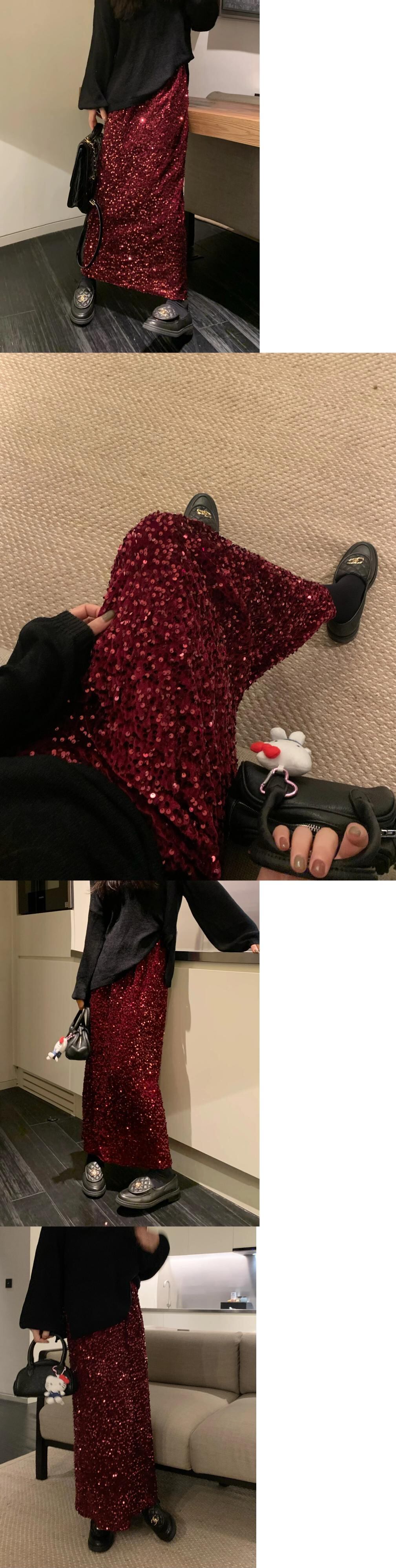 スカート レディース ブラック ウエスト ミディ スパンコール バック スリット A ライン ルーズ シンプル オールマッチ Faldas Largas Aライン