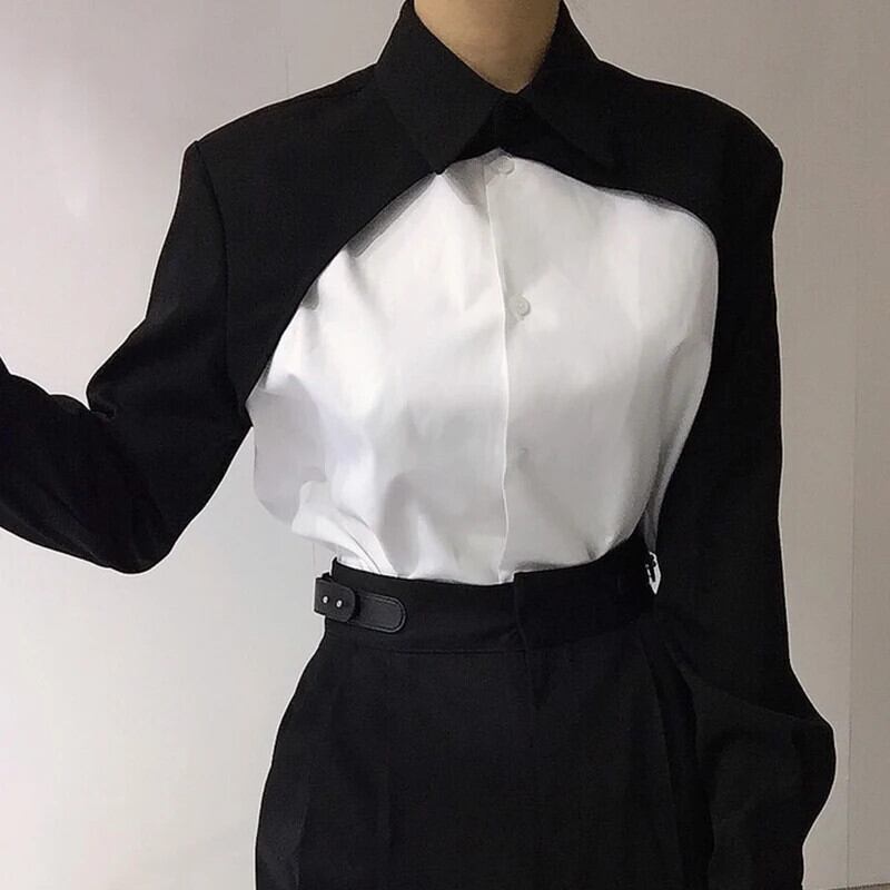 ターンダウンカラーコントラストシングルブレストトップスブラックグレーブラウス春Y2kシャツ スプリング 春物