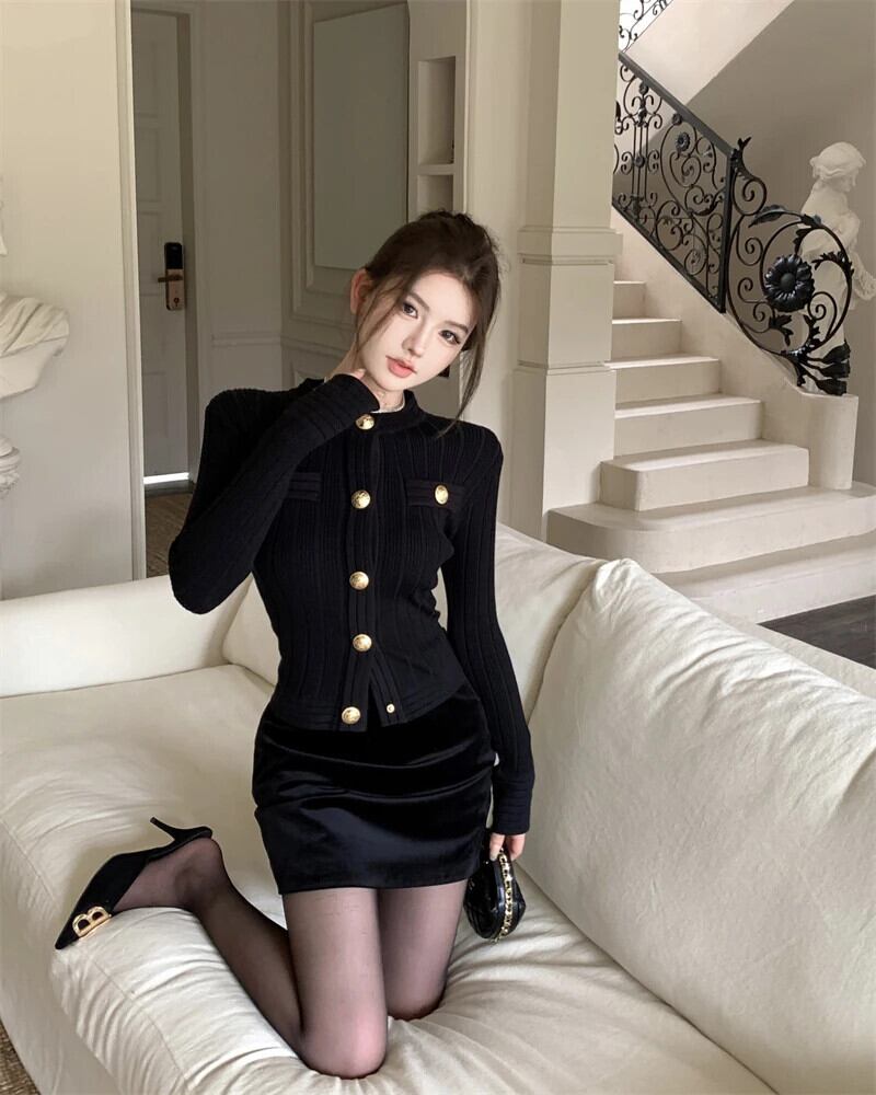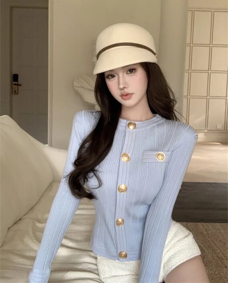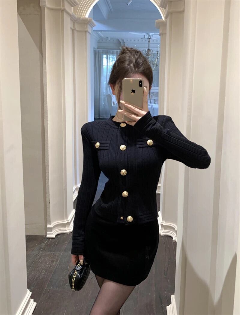 気質スリムフィットショートニットカーディガンホットスウィートY2k小さ香りスタイルメタルバックルセータージャケットプル作物 大人ガーリー キュート カジュアル
