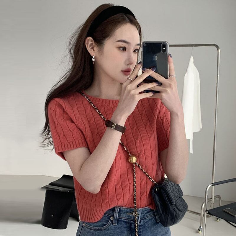 2024 基本 O ネック薄い夏プルオーバーニットリブセータースリム半袖ボディコンニット Tシャツ ショート ハーフスリーブ サマー 夏物 Oネック ソリッドカラー
