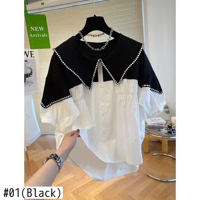 s es Hotsweet 夏クロップトップス 2024 コントラストカラードールネックシャツ半袖ブラウスストライプ Tシャツ ショート ハーフスリーブ 大人ガーリー スウィート キュート カジュアル サマー 夏物