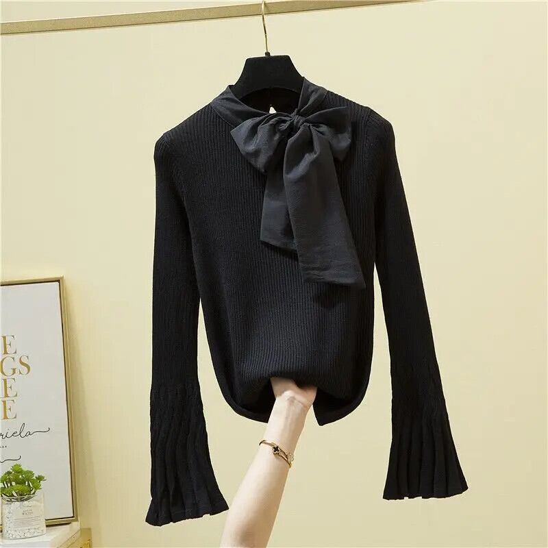 甘い蝶ネクタイフレア長袖セーター Y2k 底黒ニット秋プルオーバートップス Tシャツ ロング ブラック リボン 大人ガーリー スウィート キュート カジュアル オータム 秋物