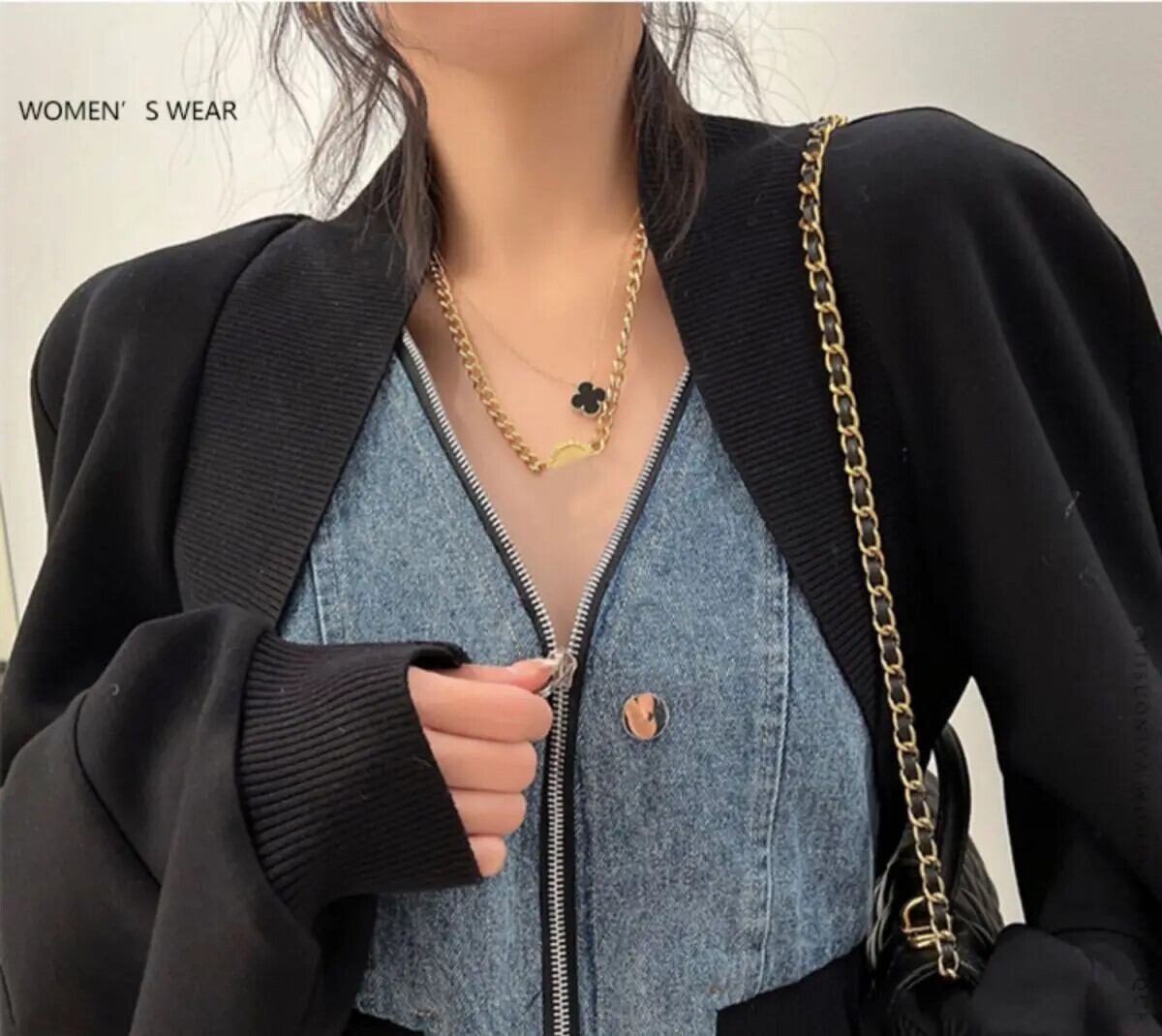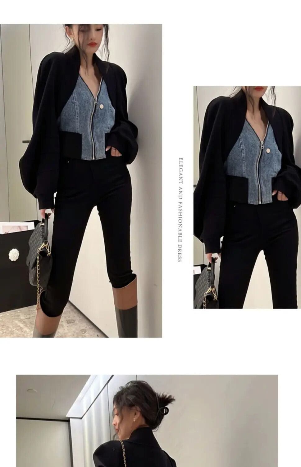 センスニッチブラックパッチワーク長袖ショートデニムジャケットジップY2kガールフェイクツーピースカーディガントップコートチャケータ ロング