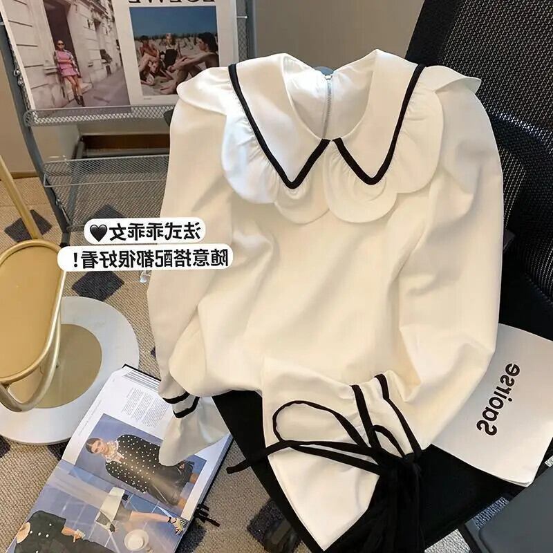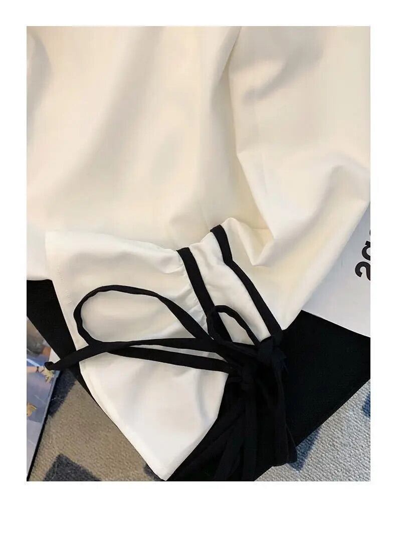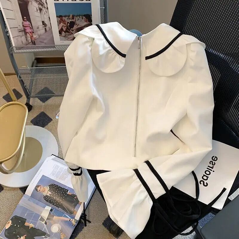 弓フレアスリーブシャツクロップトップホワイトドールネックシャツデモーダ2024ジッパーブラウス春夏シック レッド スプリング 春物 サマー 夏物