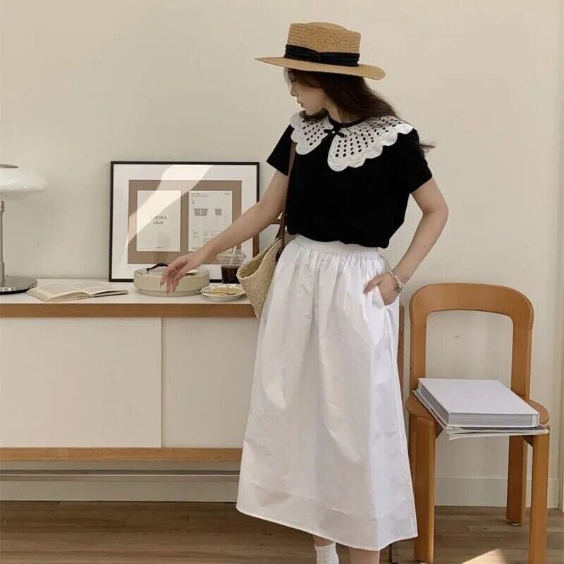 グランジグラフィック Tシャツ美的 Tシャツ原宿ドールネックパッチワークニットレース甘い半袖トップ夏黒 ショート ブラック ハーフスリーブ 大人ガーリー スウィート キュート カジュアル かわいい サマー 夏物