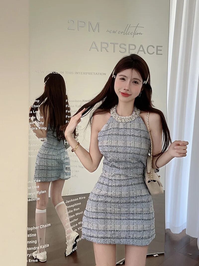 黒フレンチスタイルホルターベストドレスボディコンショート 2024 夏スリムフィット中断気質チェック柄チュニック Vestidos ブラック サマー 夏物