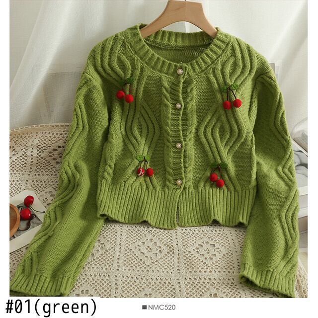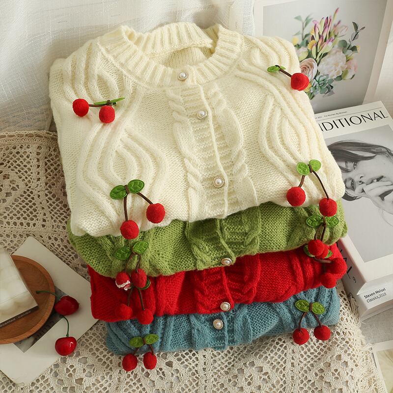 2024 シックチェリーニットカーディガン秋かわいいボタンアップ O ネック長袖コート Streatwear Y2K セーター ロング 大人ガーリー スウィート キュート カジュアル オータム 秋物 Oネック