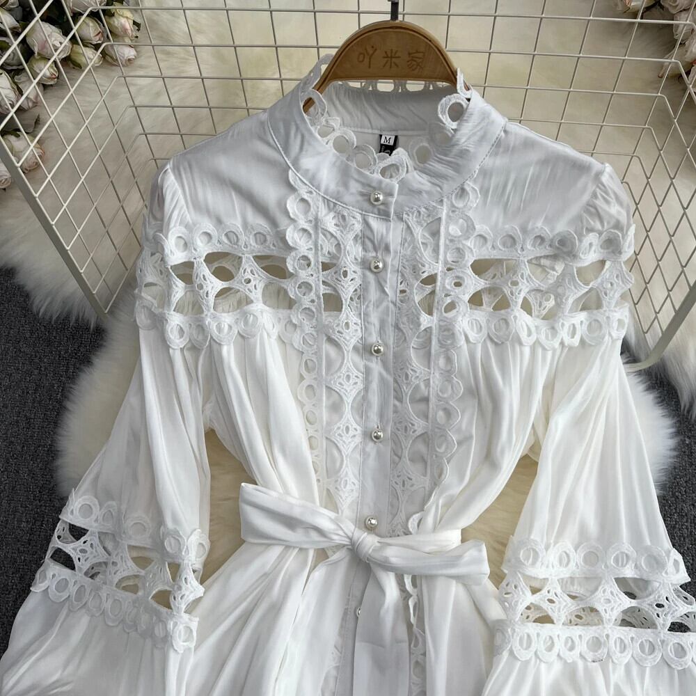 春滑走路レース刺繍アウトドレススタンドランタンスリーブシングルブレストサッシュルーズロング Vestidos スプリング 春物