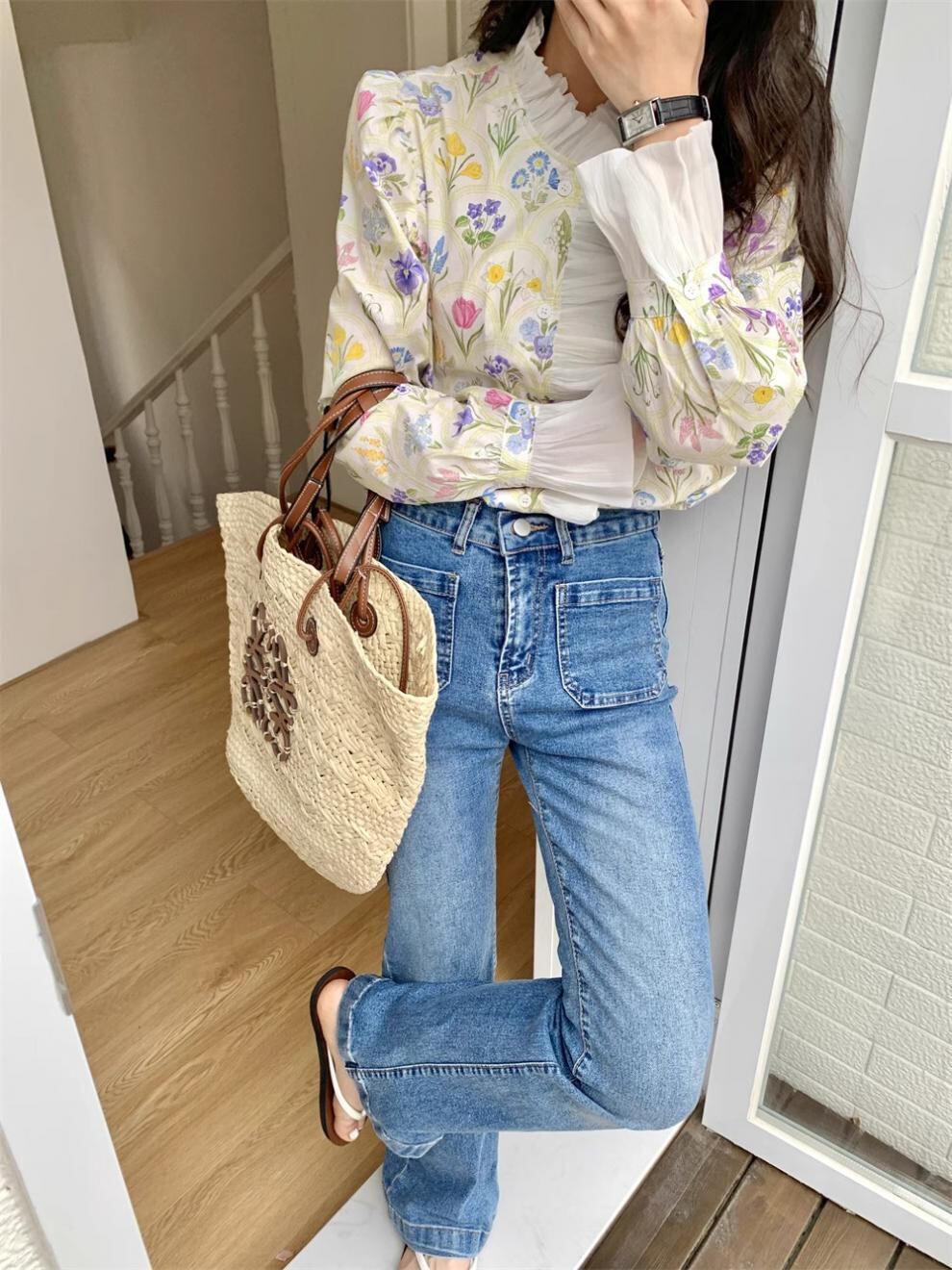 ブラウス 2024 シックでモーダ甘いブラウスネックフリル花柄フレアスリーブシャツトップ レッド 大人ガーリー スウィート キュート カジュアル