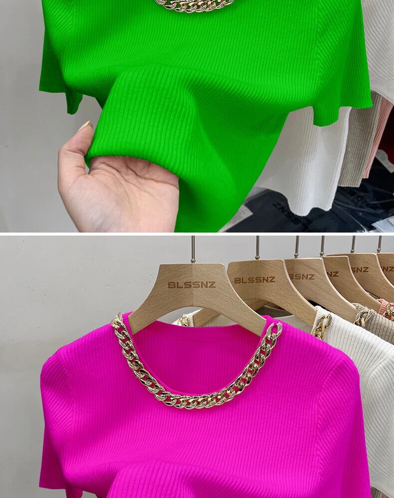 シャツ 2024 春夏 Y2k トップ Hotsweet ソリッドニットクロップ半袖セーター美的 Tシャツチェーン Tシャツ ショート ハーフスリーブ 大人ガーリー スウィート キュート カジュアル スプリング 春物 サマー 夏物 ソリッドカラー