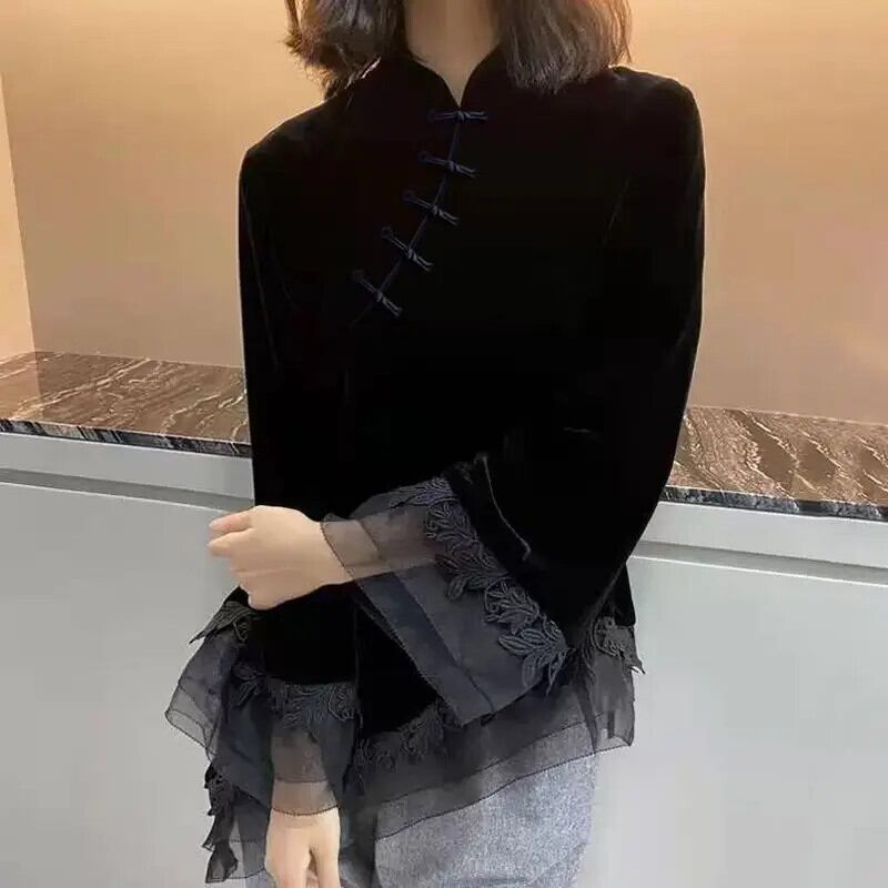 2024 春秋シノワズリスタイルスタンドカラーボタン斜め前立てレースジャカード長袖ベルベットチャイナトップシャツ ロング スプリング 春物 オータム 秋物