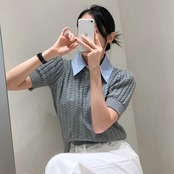ニッチ ラペル ツイスト フェイク ツー ルーズ バブル 半袖 セーター Y2k トップ グレー ニット セーター ショート ハーフスリーブ