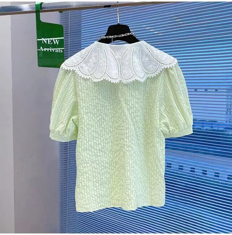 ブルーホワイトチェック柄シャツバブルスリーブドールネックパッチワークショートブラウスデモーダ2024夏クロップトップス サマー 夏物