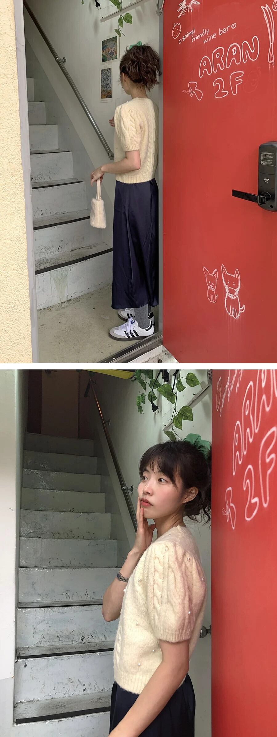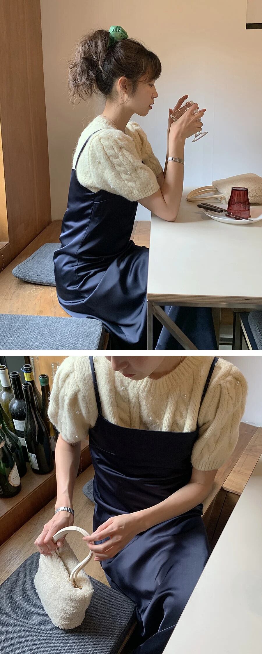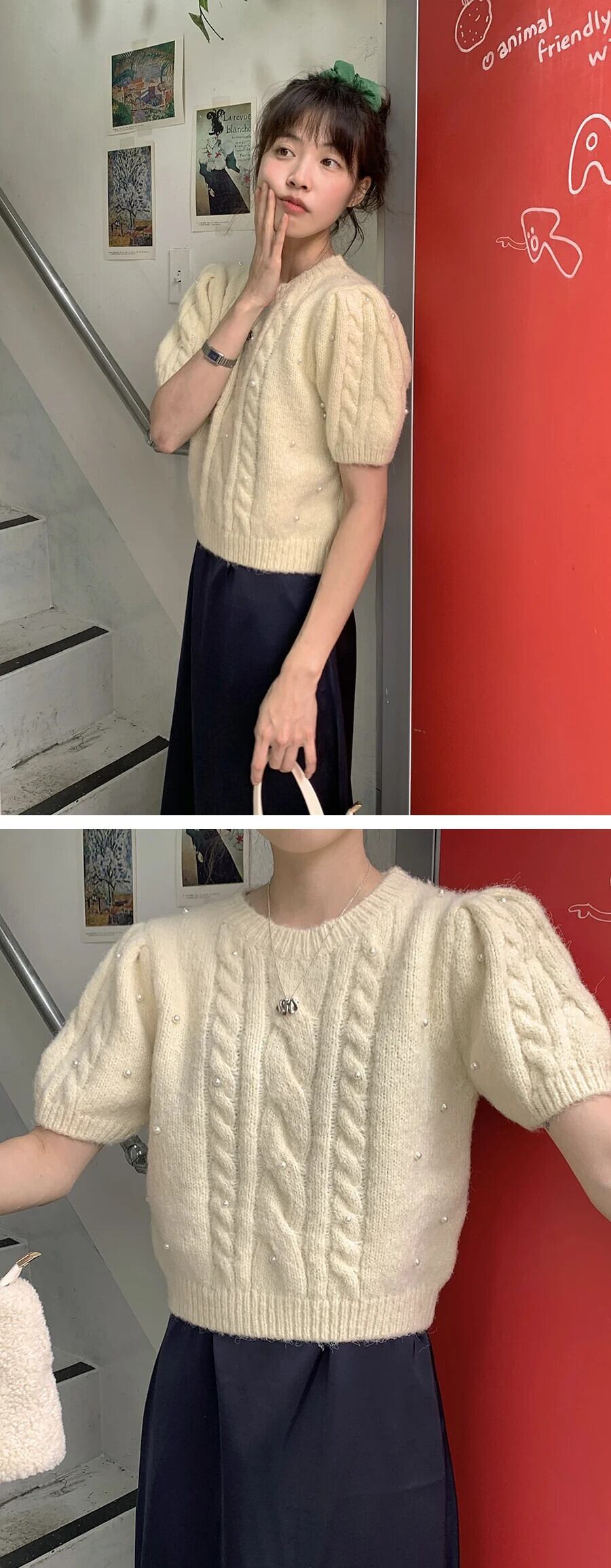 気質ラウンドネックパールルーズ多用途半袖ツイストセータージャージ 2024 ニットトップスグランジグレーセーター ショート ハーフスリーブ Oネック 真珠